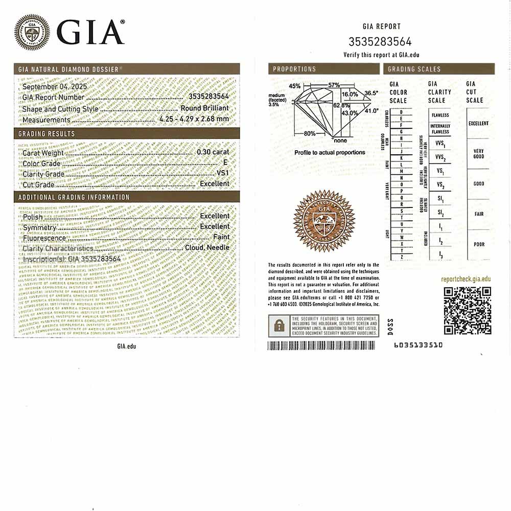 • Egy darab 4,3mm-es átmérőjű, 0,3 karátos briliáns csiszolású, természetes gyémánt (E szín, VS1 tisztaság, GIA certifikát, 3xExcellent csiszolás)
