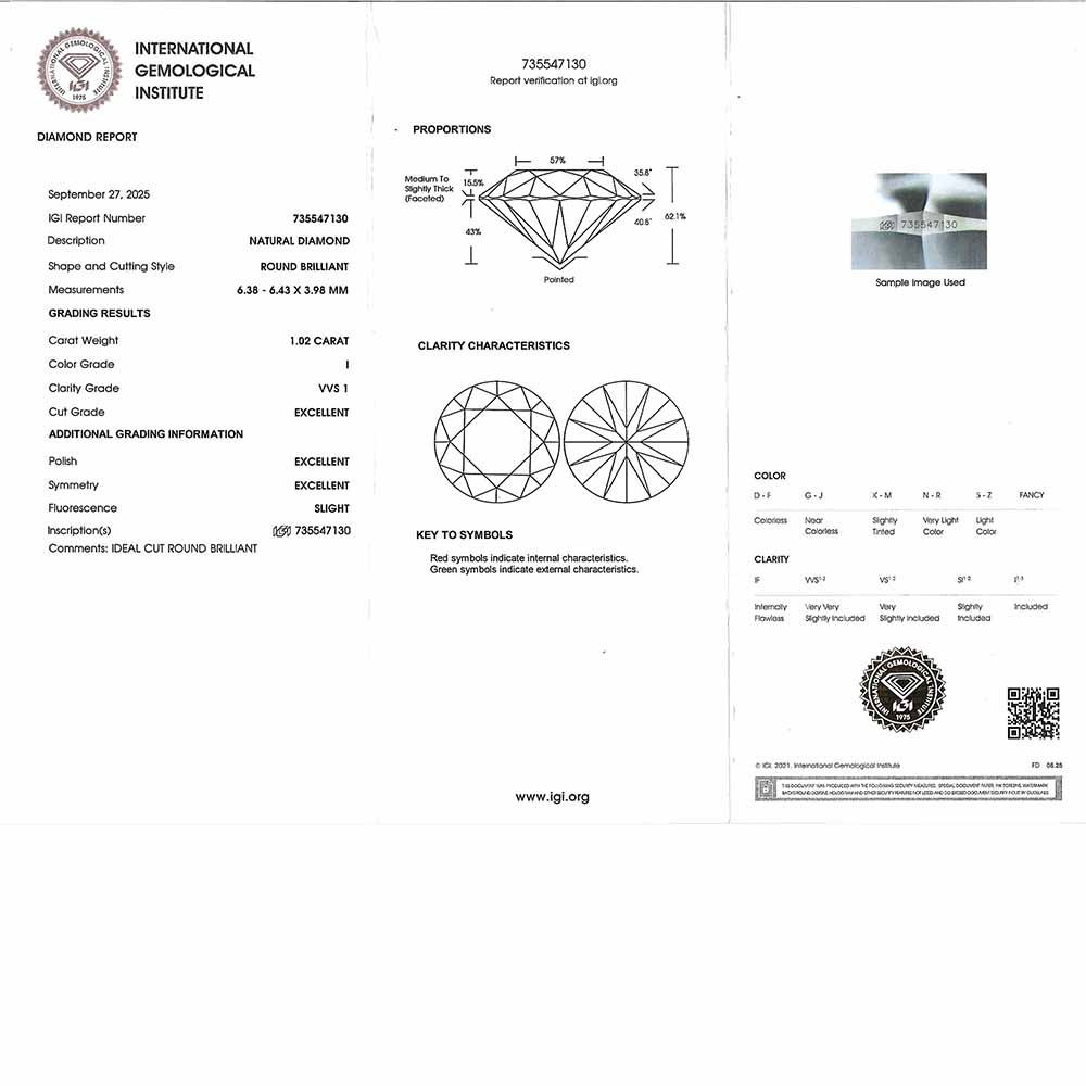 • Egy darab 6,4mm-es, briliáns csiszolású, természetes gyémánt (1,02 karát, I szín, VVS1 tisztaság, IGI certifikát, 3xExcellent csiszolás)