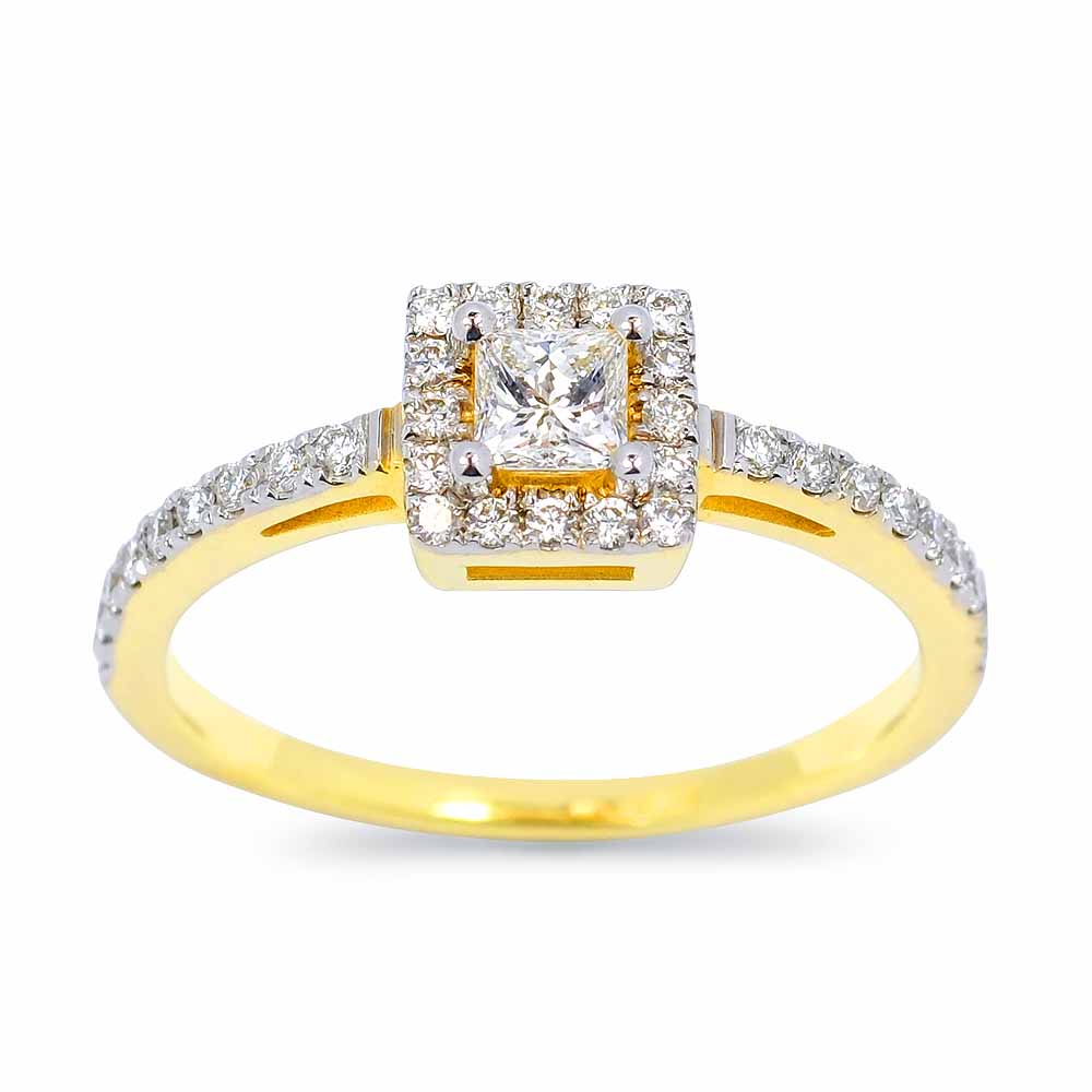 Princess gyémánt eljegyzési gyűrű 0,5 karát gyémánt kővel, 14K aranyból, Halo stílusban