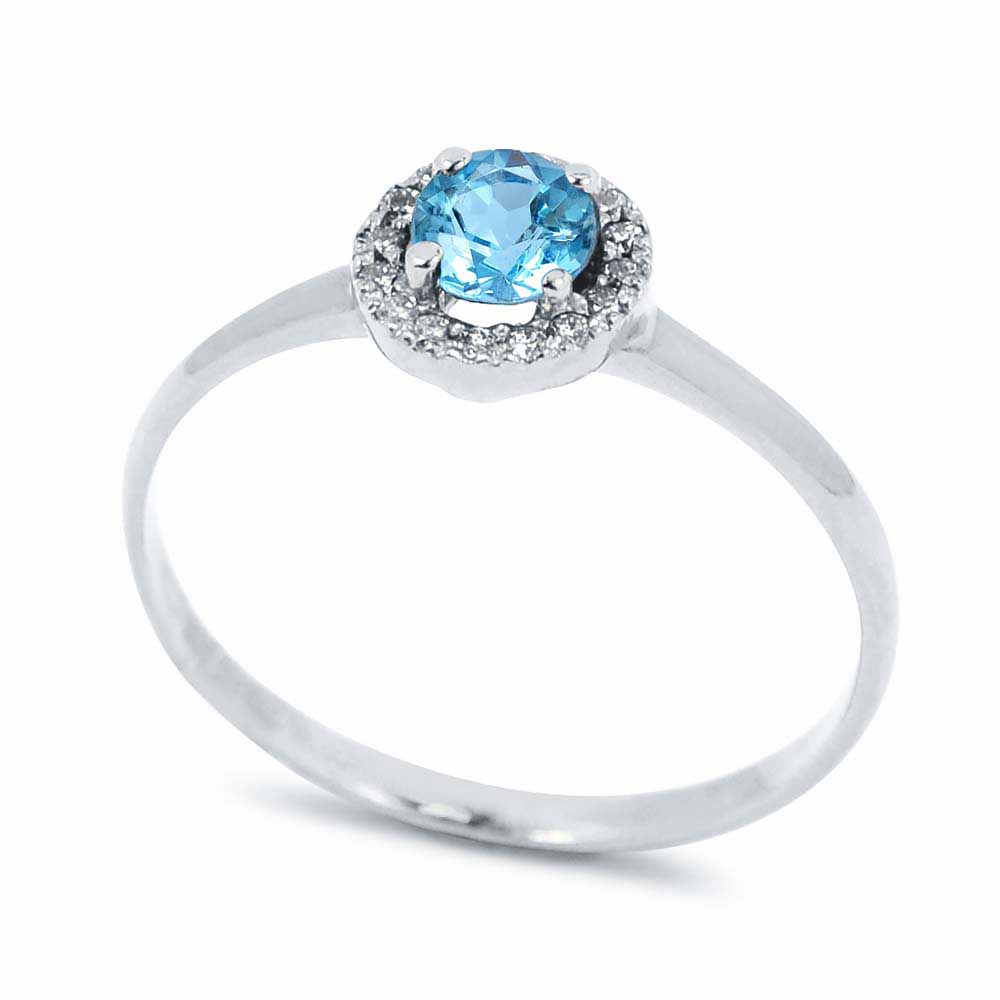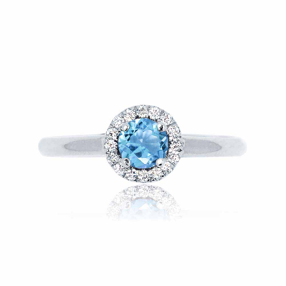 Kék topáz és fehér (színtelen) gyémánttal foglalt 14 karátos fehérarany halo stílusú eljegyzési gyűrű
