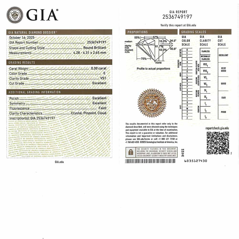 • Egy darab 4,3mm átmérőjű, briliáns csiszolású, természetes gyémánt (0,3 karát, E szín, VS1 tisztaság, GIA certifikát, 3XExcellent csiszolás)