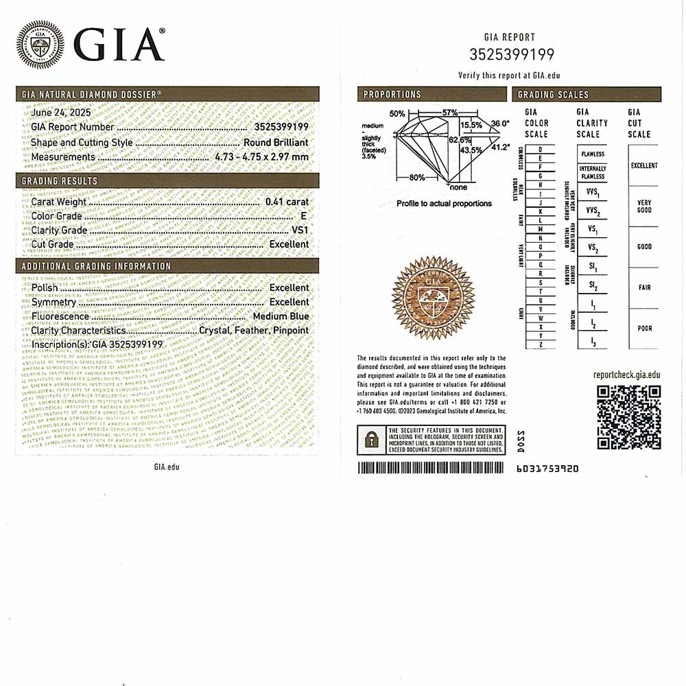 Csodás brillanciájú (3xExcellent), 4,7mm-es átmérőjű, 0,41 karátos természetes gyémánttal foglalt klasszikus arany eljegyzési gyűrű. A 0,41 karátos gyémánt követ elegáns négy karmos foglalat tartja, melyen a fény könnyen áthatol, még inkább növelve a briliáns csiszolású drágakő csillogását. A gyémánt magas minőségű, teljesen színtelen 'E' színű, 'VS1' tisztaságú és nemzetközi GIA certifikát is tartozik hozzá, lézergravírozott sorszámmal. A gyémánt eljegyzési gyűrű 1,6 grammos. Kérésre díjmentesen igazítunk a gyűrű méretén. Készletről megvásárolható.