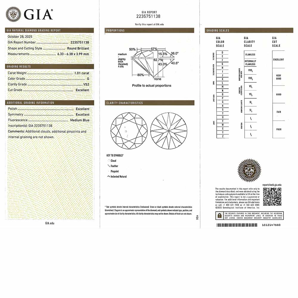 • Egy darab 6,4mm átmérőjű briliáns csiszolású, természetes gyémánt (1,01 karát, G szín, VS2 tisztaság, GIA certifikát, 3xExcellent csiszolás)
