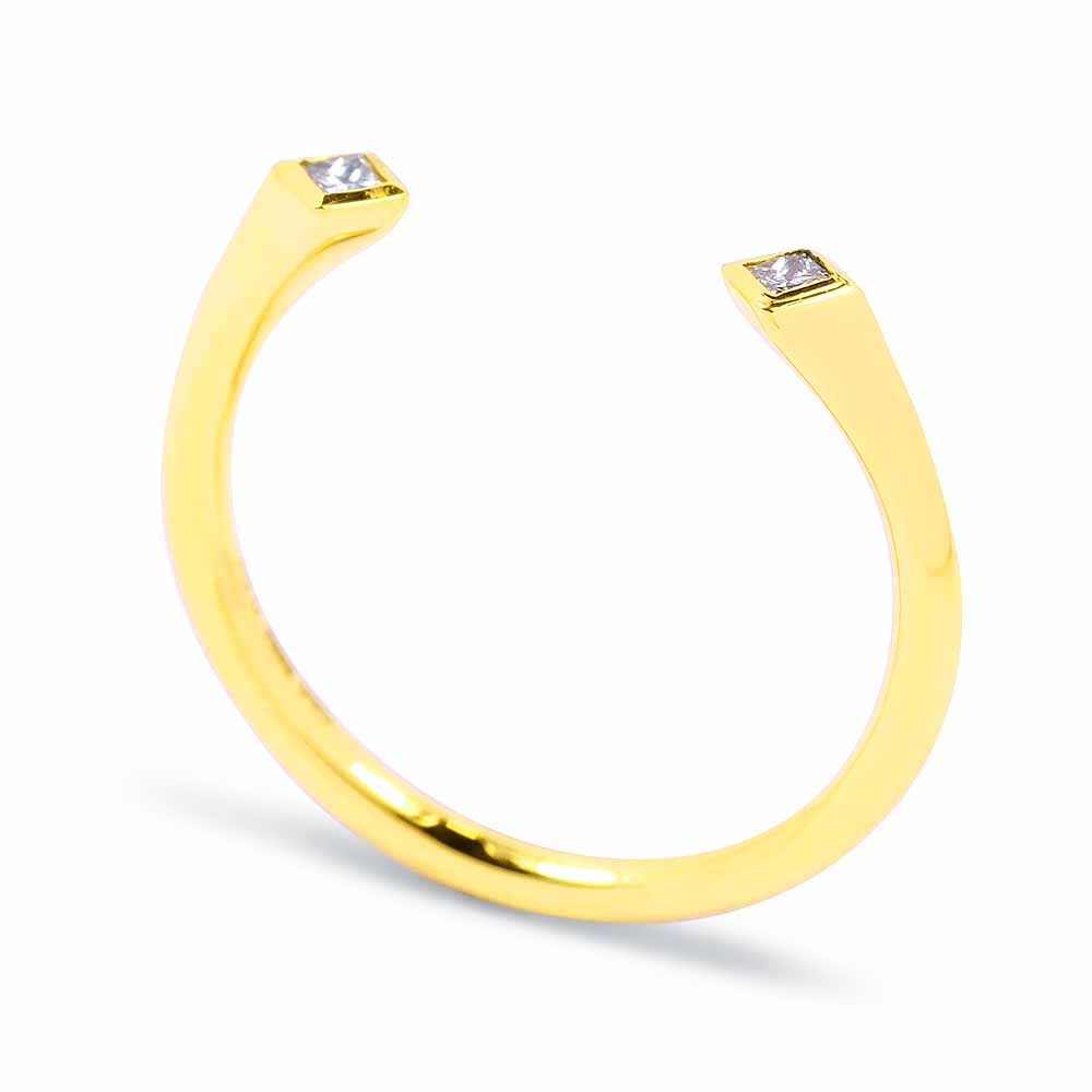 Két apró princess (négyszögletes) gyémánt kővel díszített arany gyűrű, egyedi, nyitott stílusban. A két princess gyémánt a gyűrű két szárának végén díszeleg, zárt foglalat öleli körbe. A princess gyémánt gyűrű súlya 1,5 gramm, 14 karátos aranyból készült. A két gyémánt kő összesen 0,07 karát. Hordjál akár többet együtt! Kérésre a gyűrű méretén díjmentesen igazítunk. Készletről megvásárolható.