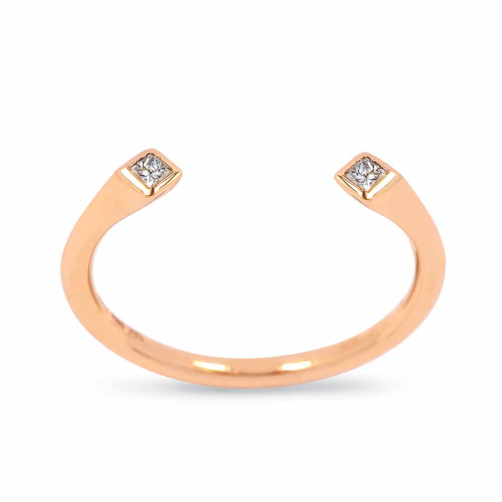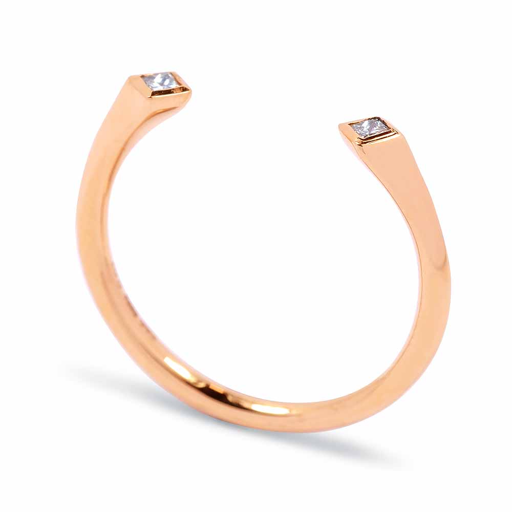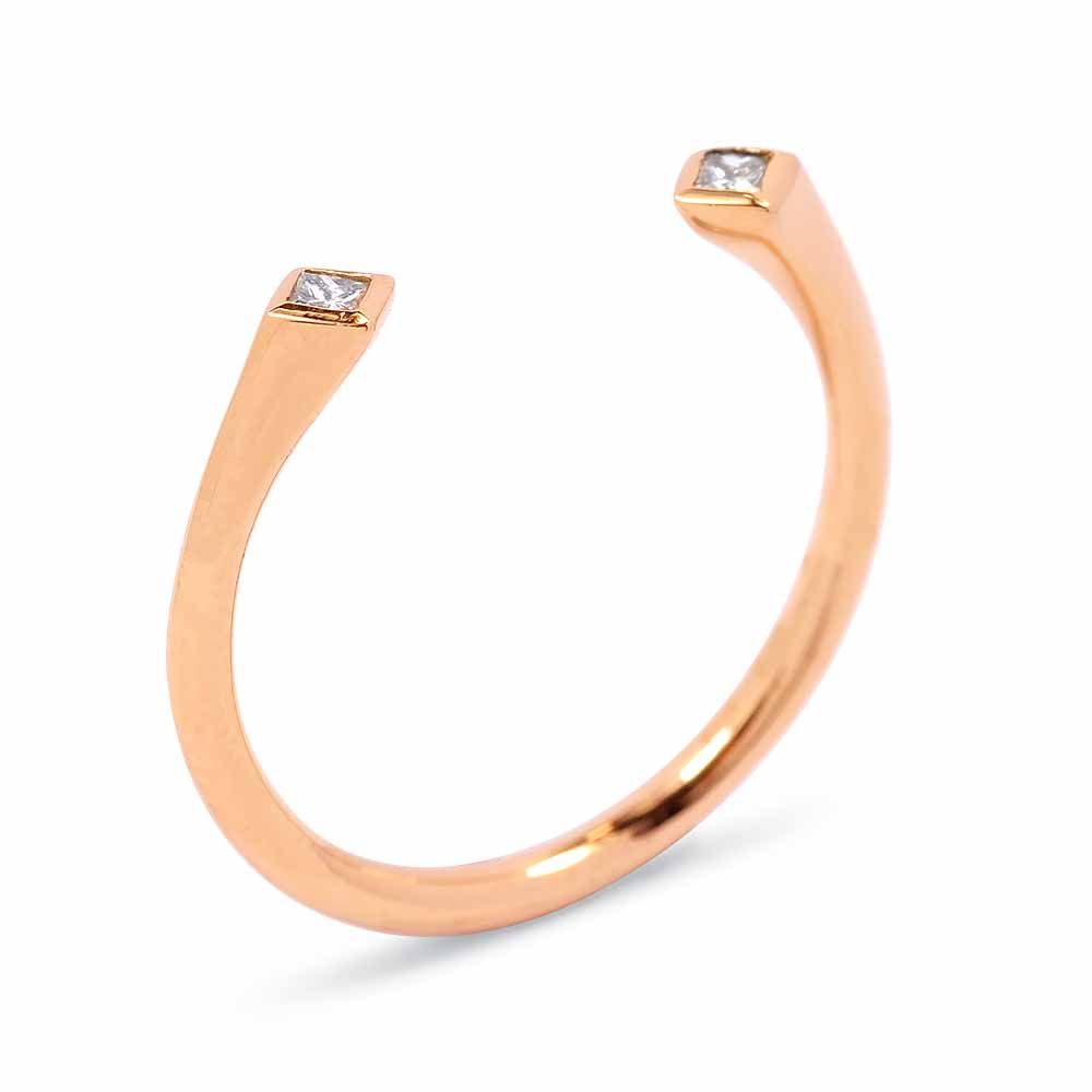 Két apró princess (négyszögletes) gyémánt kővel díszített rosegold gyűrű, egyedi, nyitott stílusban. A két princess gyémánt a gyűrű két szárának végén díszeleg, zárt foglalat öleli körbe. A princess gyémánt gyűrű súlya 1,5 gramm, 14 karátos rose aranyból készült. A két gyémánt kő összesen 0,07 karát. Hordjál akár többet együtt! Kérésre a gyűrű méretén díjmentesen igazítunk. Készletről megvásárolható.