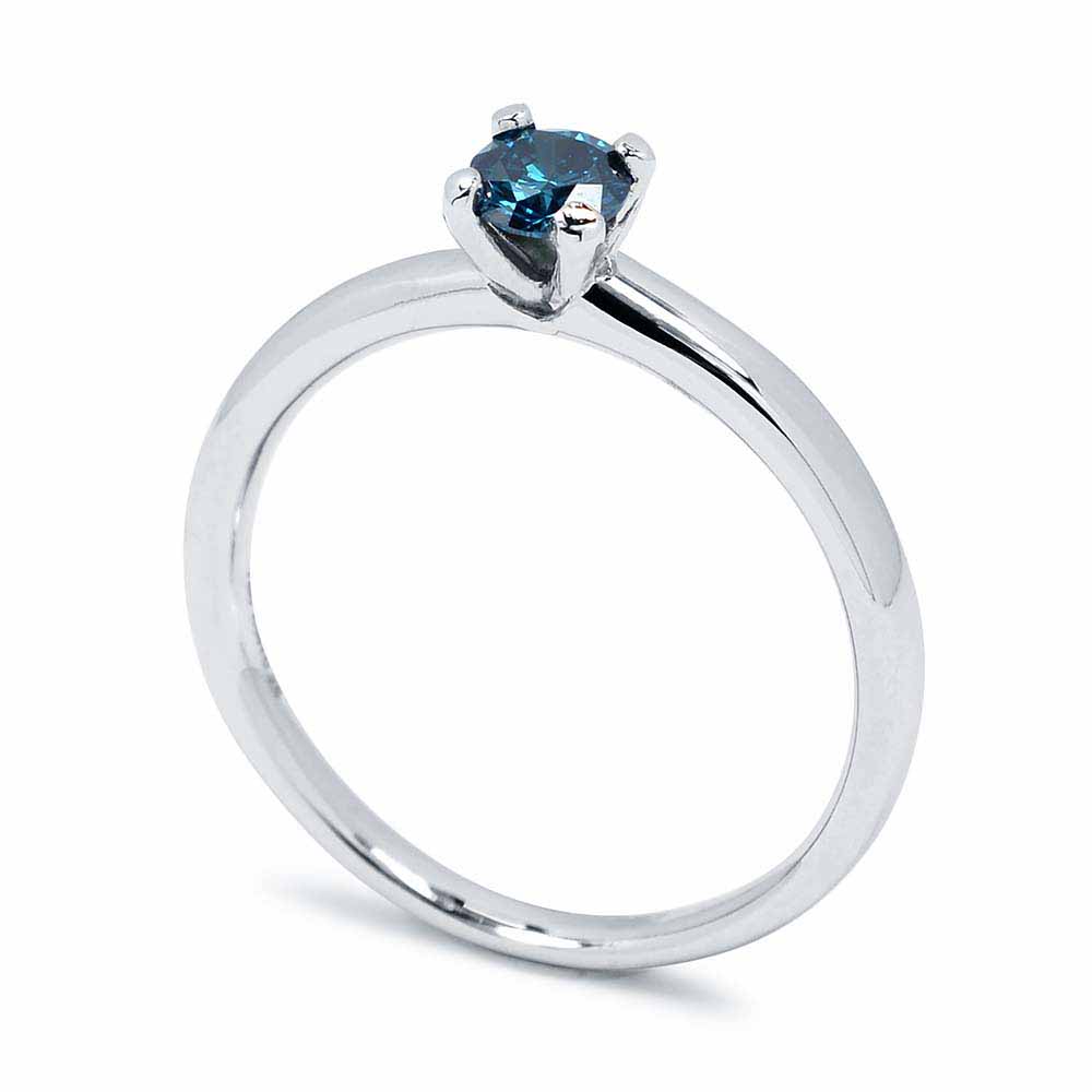 Több, mint 0,24 karátos, kék brill kővel készített gyémánt eljegyzési gyűrű. A 4,0mm-es átmérőjű, 0,24 karátos kék gyémántot, kecses, kerek profilú gyűrű hordozza. A gyémánt kő  tisztasága VS1 és négy karom tartja biztonságban. A gyémánt természetes eredetű, színét mesterséges eljárással nyerte. Az eljegyzési gyűrű 14 karátos fehéraranyból, kézzel készült, súlya 2,3 gramm. Kérésre díjmentesen méretre igazítjuk, akár utólag is. Jelenleg megrendelésre.