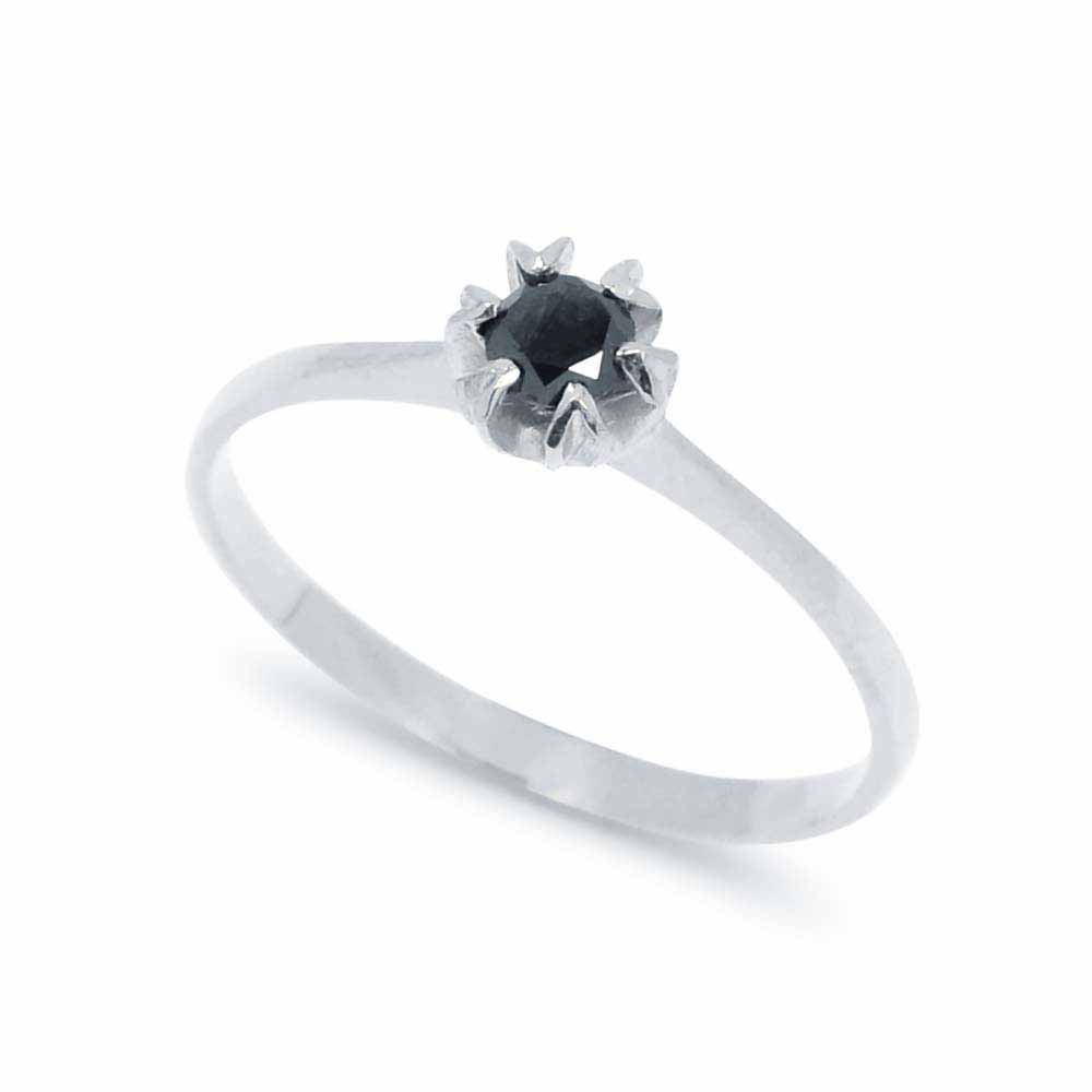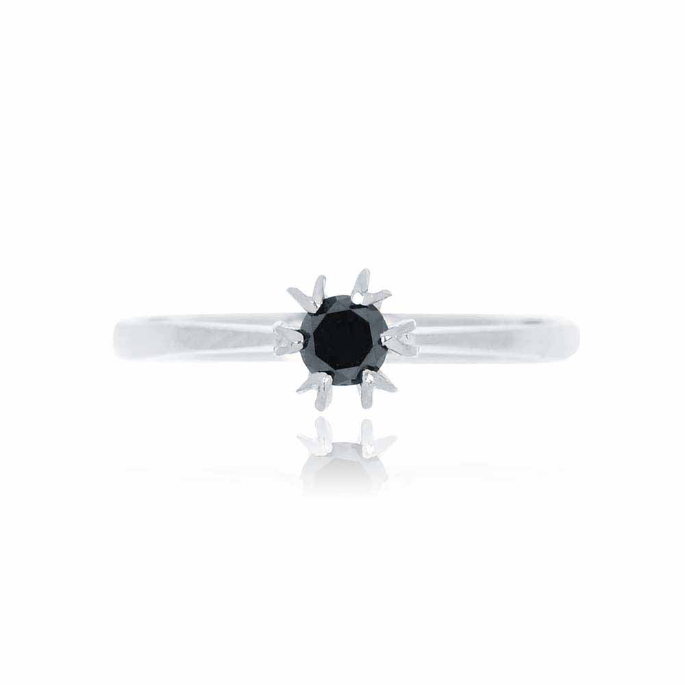 Fehéraranyból készült eljegyzési gyűrű 3,5mm-es átmérőjű, briliáns csiszolású fekete gyémánttal. A fekete, briliáns csiszolású gyémánt súlya 0,183 karát és egy felülről virág alakzatot formáló, hat karmos foglalat tartja biztonságban. Jelenleg megrendelésre.