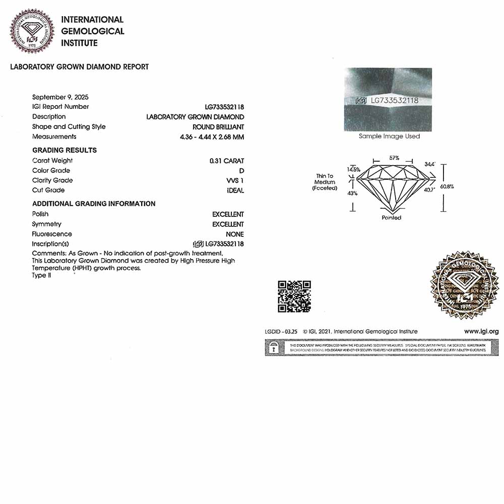 • Egy darab 4,3mm átmérőjű, briliáns csiszolású, mesterséges gyémánt (0,31 karát, D szín, VVS1 tisztaság, HPHT, IGI certifikát, 3x Excellent csiszolás)