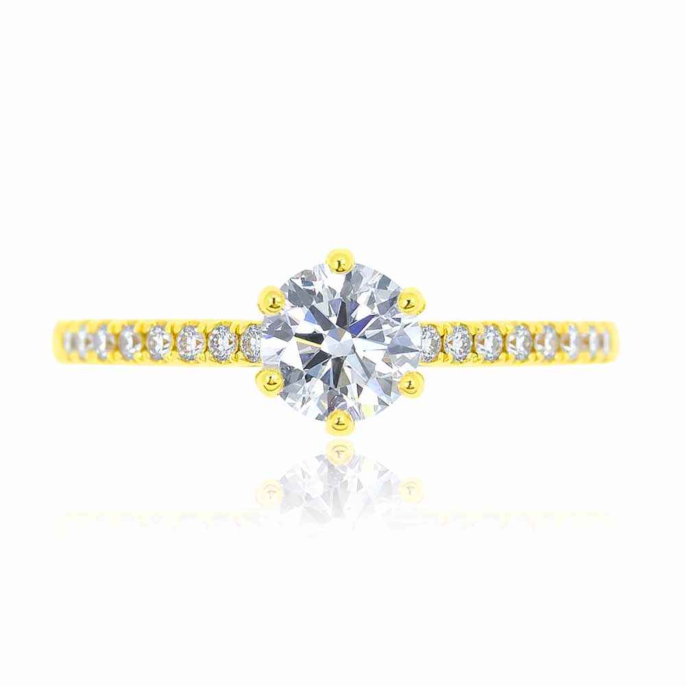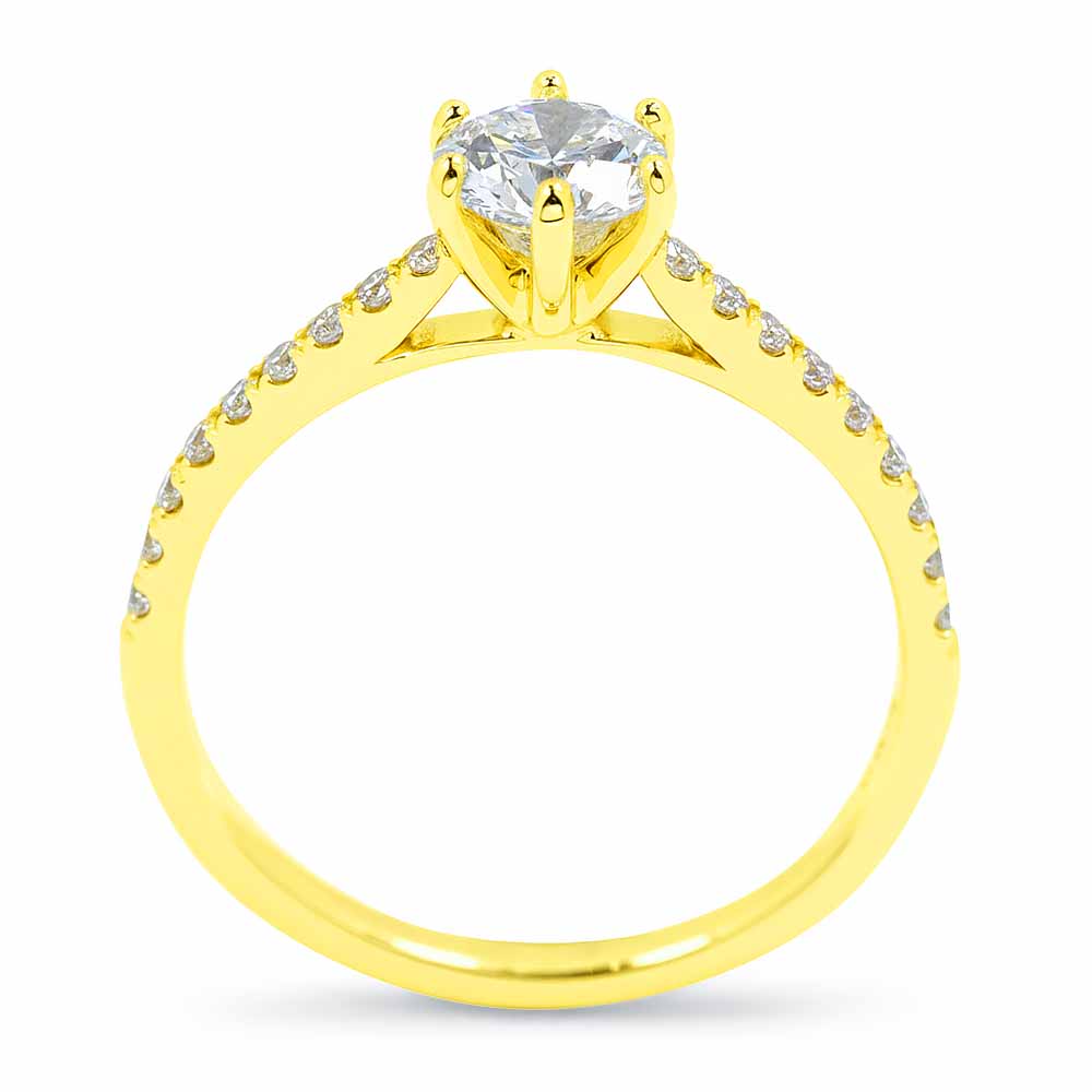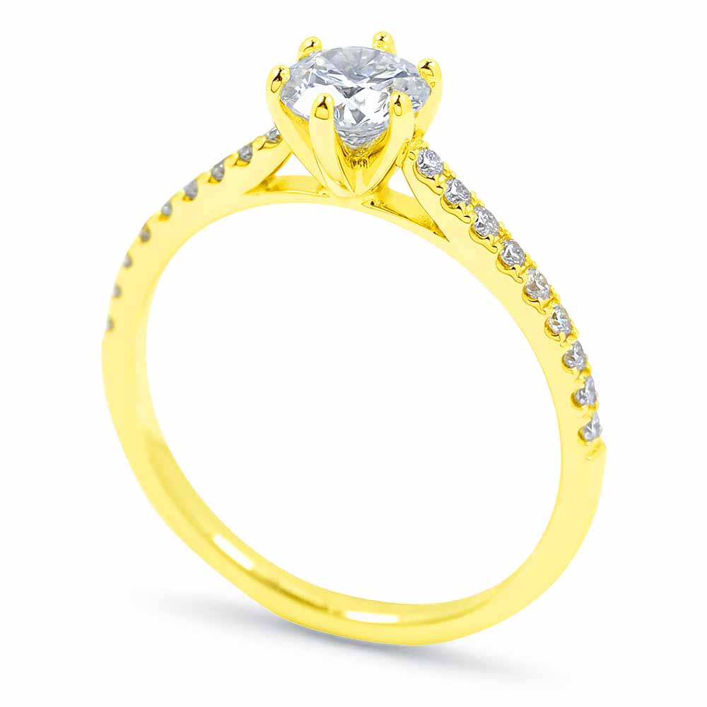 Hatkarmos eljegyzési gyűrű középen 0,71 karátos, IGI certifikált, szintetikus gyémánt kővel + oldalában 10-10 labor briliánssal - arany