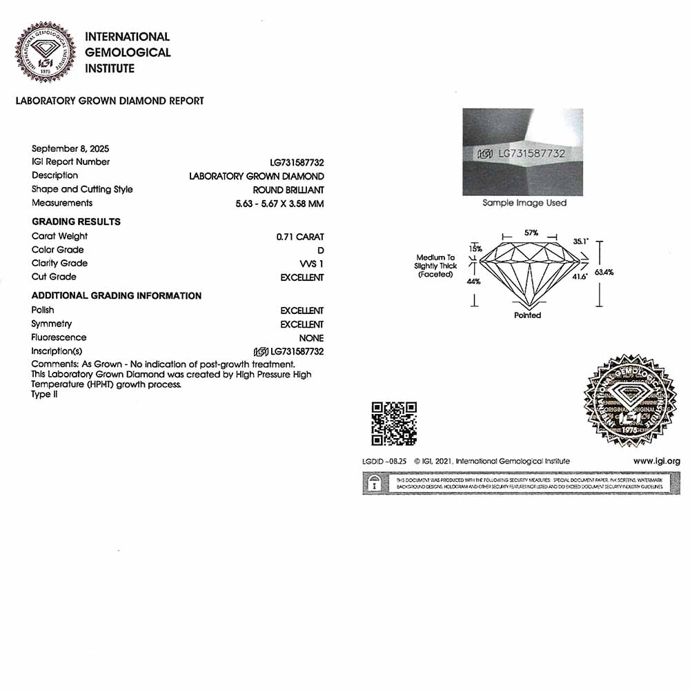 • Egy darab 5,6mm-es, briliáns csiszolású, mesterséges gyémánt (0,71 karát, D szín, VVS1 tisztaság, IGI certifikát, 3xExcellent)