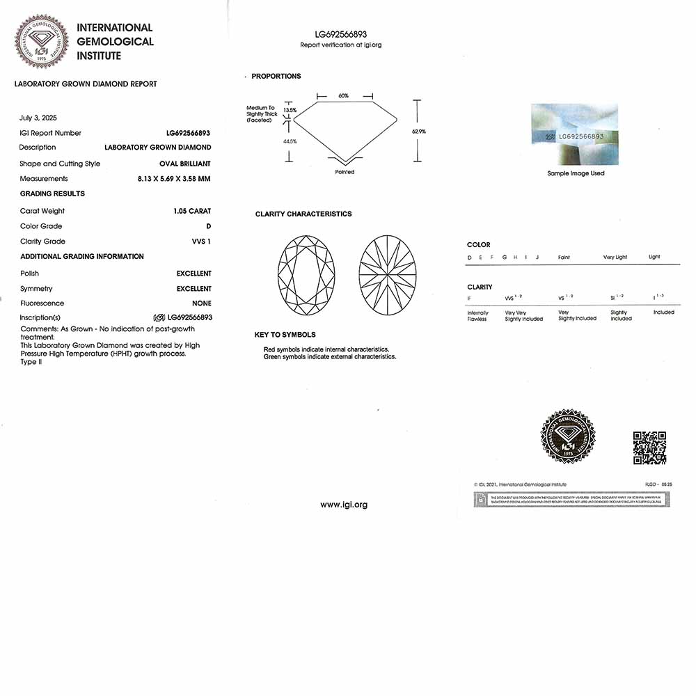 • Egy darab 8,1x5,7mm-es ovális csiszolású, mesterséges gyémánt (1,05 karát, D szín, VVS1 tisztaság, Excellent csiszolás, IGI certifikát)