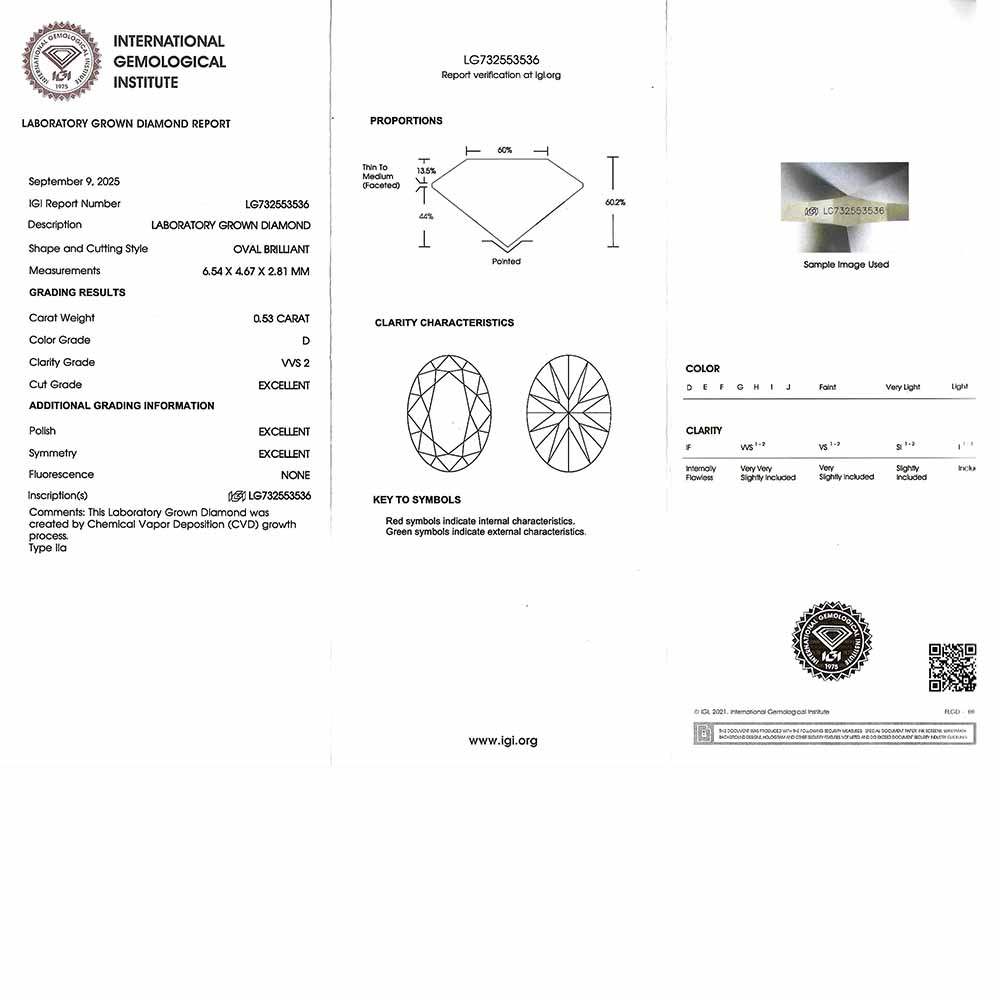 • Egy 6,5x4,7mm-es, ovális csiszolású, mesterséges gyémánt (0,53 karát, D szín, VVS2 tisztaság, IGI certifikát, Excellent csiszolás)