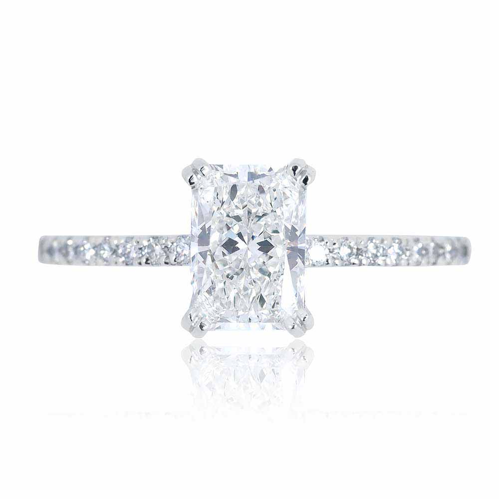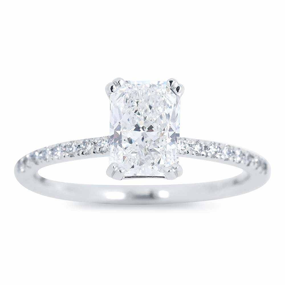 Eljegyzési gyűrű középen 1,5 karátos radiant csiszolású labor gyémánttal, oldalt briliánsokkal