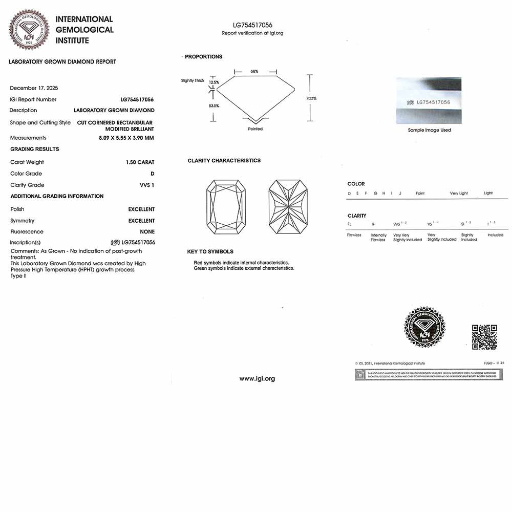 • Egy darab 8,1x5,5mm-es radiant csiszolású, mesterséges gyémánt (1,5 karát, D szín, VVS1 tisztaság, Excellent csiszolás, IGI certifikát)