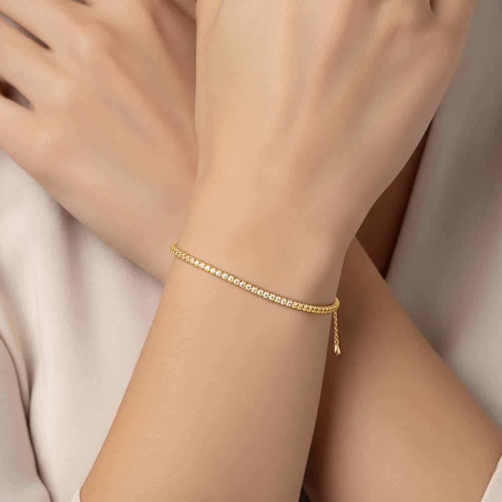 Vékony karlánc 38 darab valódi gyémánttal sorba díszítve. A gyémántokat négy karmos foglalatok tartják, és hasonlóan a tenisz karkötőhöz, láncszerűen vannak egymáshoz fűzve, így rásimulnak a csuklóra. A gyémántok arany lánchoz csatlakoznak, melynek hossza speicális csúszka segítségével tetszőlegesen állítható. A gyémánt karkötő súlya összesen 2,0 gramm és 18 karátos aranyból készült. Készletről megvásárolható.