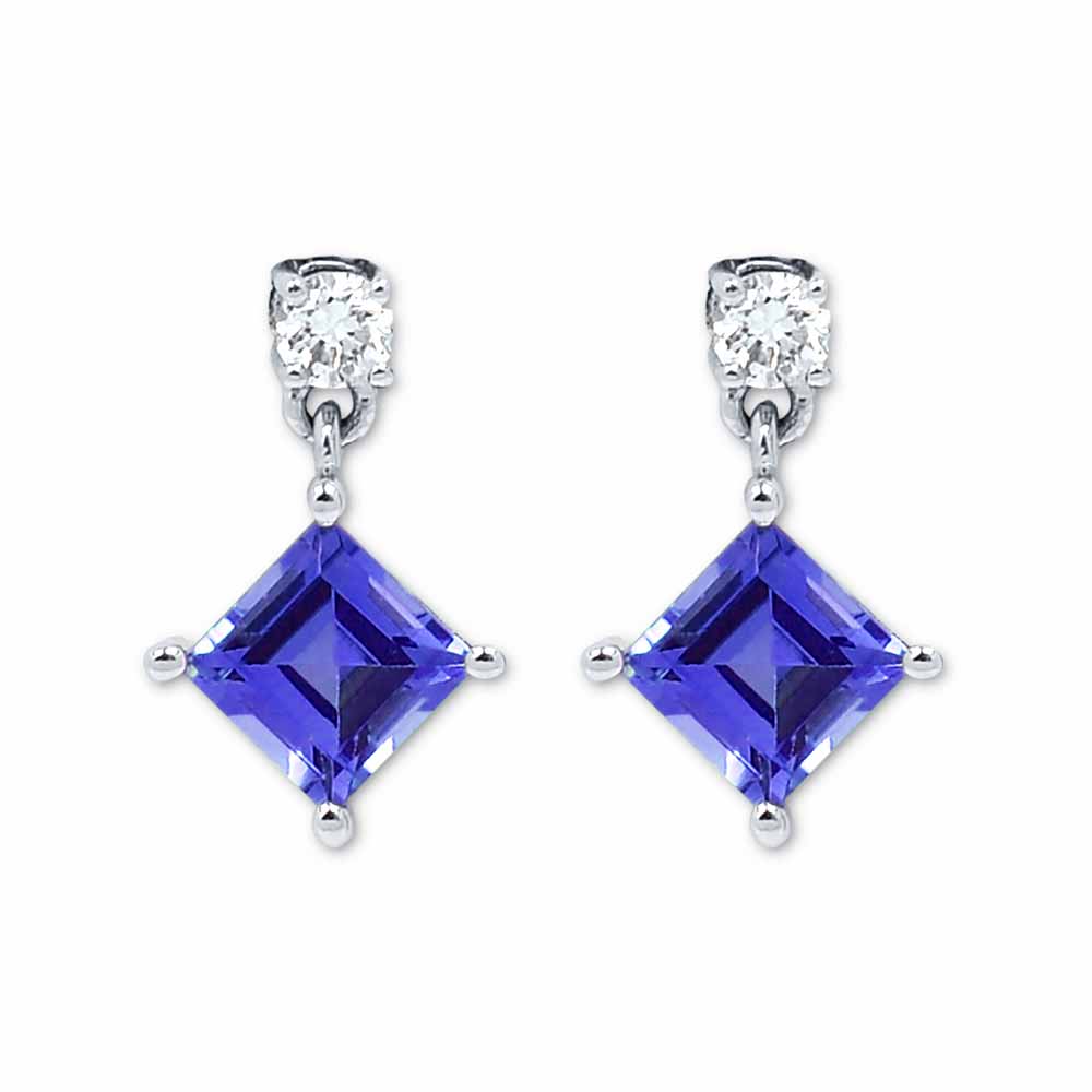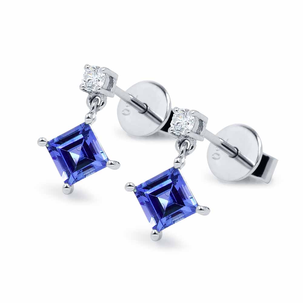 Különleges fülbevaló négyszögletes tanzanit és kerek gyémánt drágakövekkel, 18K fehéraranyból
