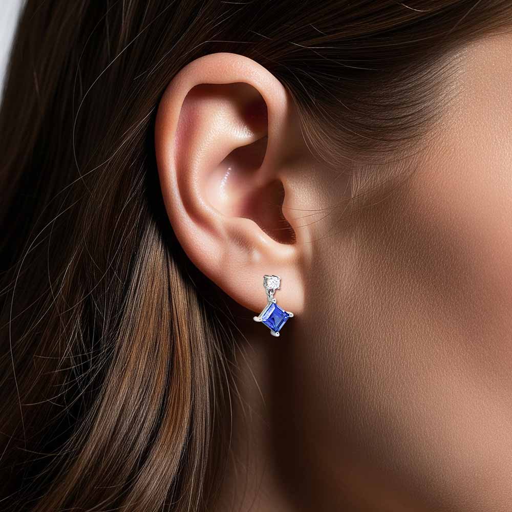 18 karátos fehér aranyból készült fülbevaló tanzanit drágakővel. A két fél karátos, különleges kék árnyalatú, négyszögletes csiszolású drágakövet négy karmos foglalat tartja, mely egy-egy gyémánt kövecske alatt csüng. A fülbevaló betűzös (stekkeres) zárral rögzül, összesen 0,09 karát gyémánt kővel. A tanzanit fülbevaló pár súlya 1,6 gramm. Készletről megvásárolható.