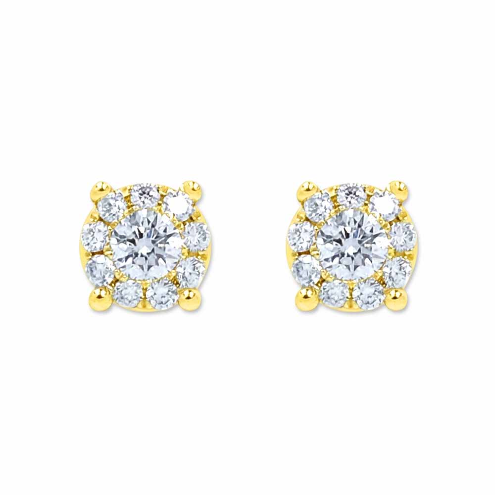 Apró kerek formájú fülbevaló, körbe rakva briliánsokkal, középen pedig egy nagyobb méretű gyémánttal. A fülbevalóban összesen 0,16 karát gyémánt csillog és 14 karátos aranyból készült. A gyémántok úgy vannak foglalva, hogy egy nagyobb drágakő hatását keltik! A gyémánt kövek F színűek és SI1 tisztaságúak. Stekkeres (betűzős) zárral rögzül, a gyémánt fülbevaló pár súlya 0,9 gramm. Keresd a hozzá illő medált is! Készletről elérhető.
