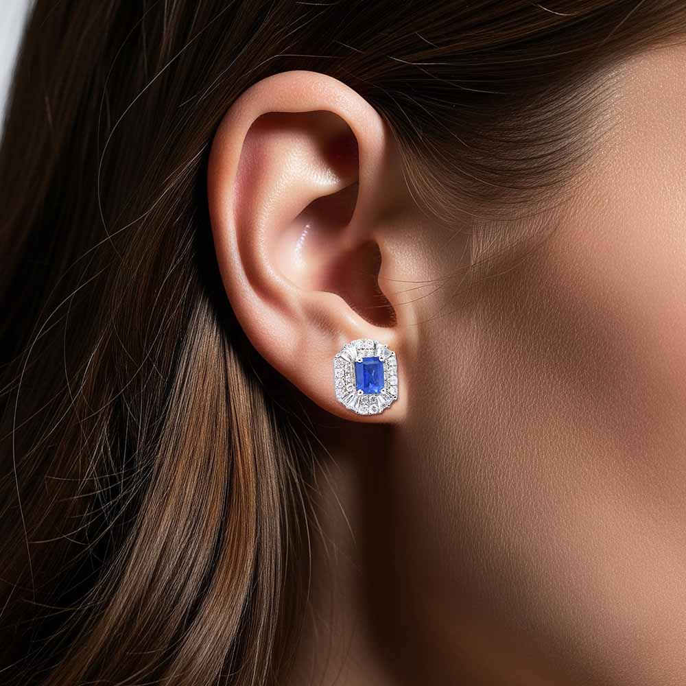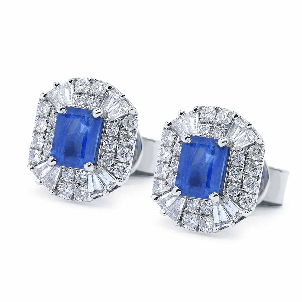 Két szépséges sötétkék, természetes zafír kővel ékesített fülbevaló. A két zafír négyszögletes formára van megcsiszolva, együttes súlyuk 0,9 karát. A két zafír követ gyémántok veszik körül, összesen 0,66 karátnyi, így több, mint 1,5 karát drágakő ékesíti a fülbevalót. A gyémántok közt kerek briliánsok és trapéz formára csiszolt baguette gyémántok is akadnak, így alakul ki a szépséges csillogás. A klasszikus stílusú zafír fülbevaló betűzős (stekkeres) zárral rögzül. A pár súlya 2,8 gramm, 18 karátos fehéraranyból készült. Zafír ékszer - Uralkodói vér az örökkévalóságban. Készletről megvásárolható.