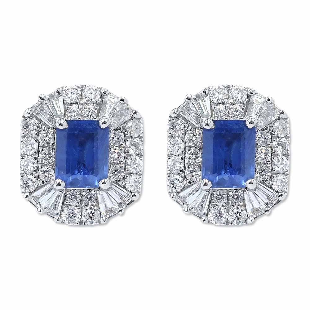 Kék zafír kövekkel díszített fehérarany fülbevaló további baguette és briliáns gyémántokkal - 1,5 karát