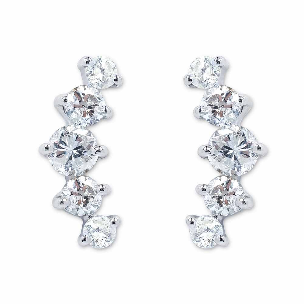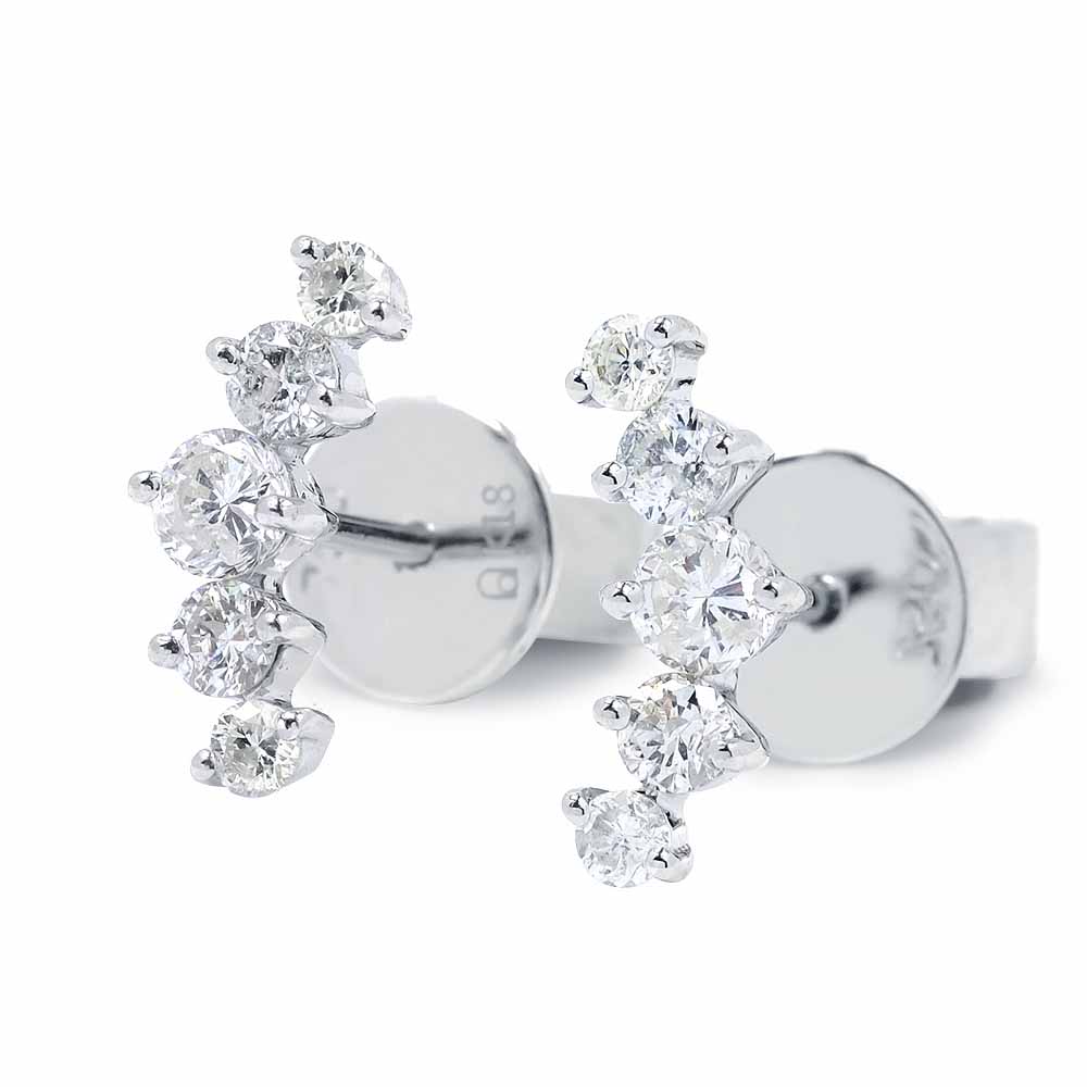 Modern stílusú, ívelt fülbevaló 5-5 darab briliáns csiszolású valódi gyémánt kővel. A középre haladva növekvő sorban követik egymást, mindegyiket külön karmos foglalat tartja. A gyémánt fülbevalóban összesen több, mint 0,4 karátnyi gyémánt kapott helyet, melyek szépen csillognak, és 'G-H' szín és 'SI-I' tisztaság besorolással rendelkeznek. 18 karátos fehér aranyból készült és stekkeres (betűzős) zárral rögzül, a pár súlya 1,7 gramm. Készletről megvásárolható.