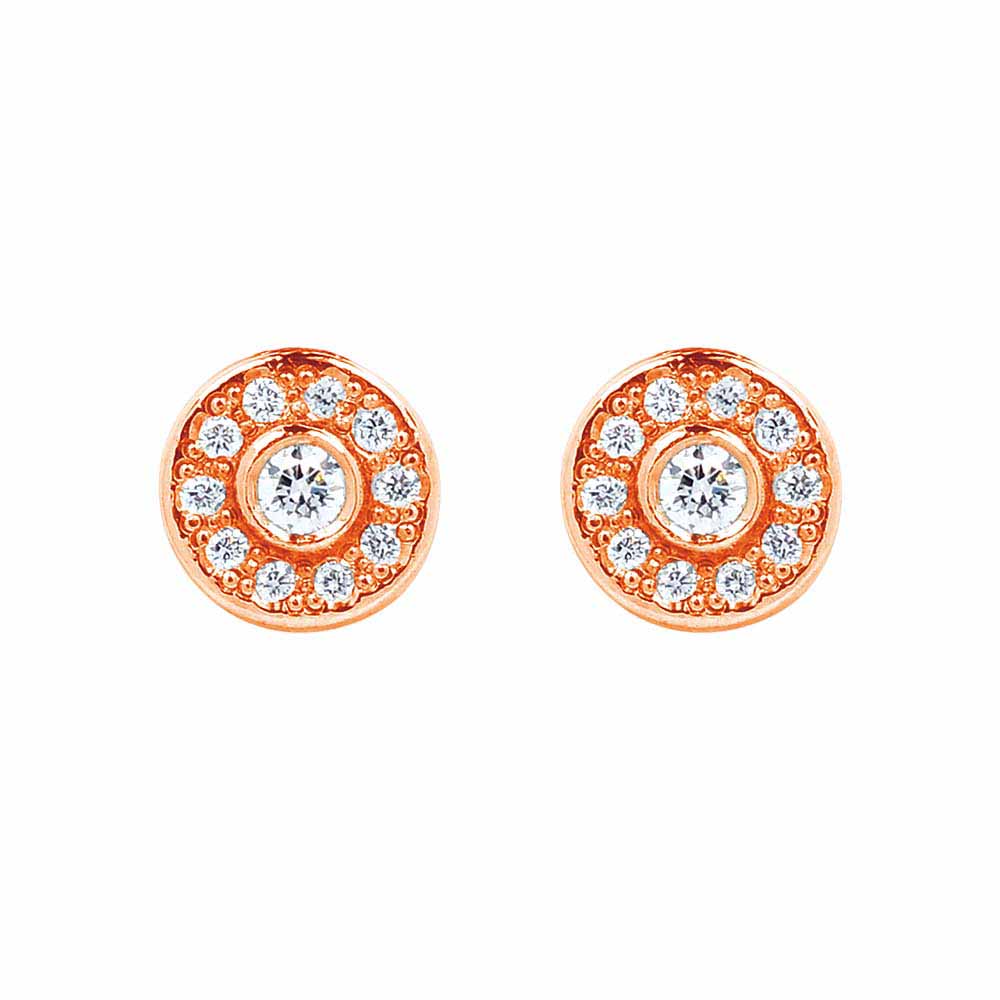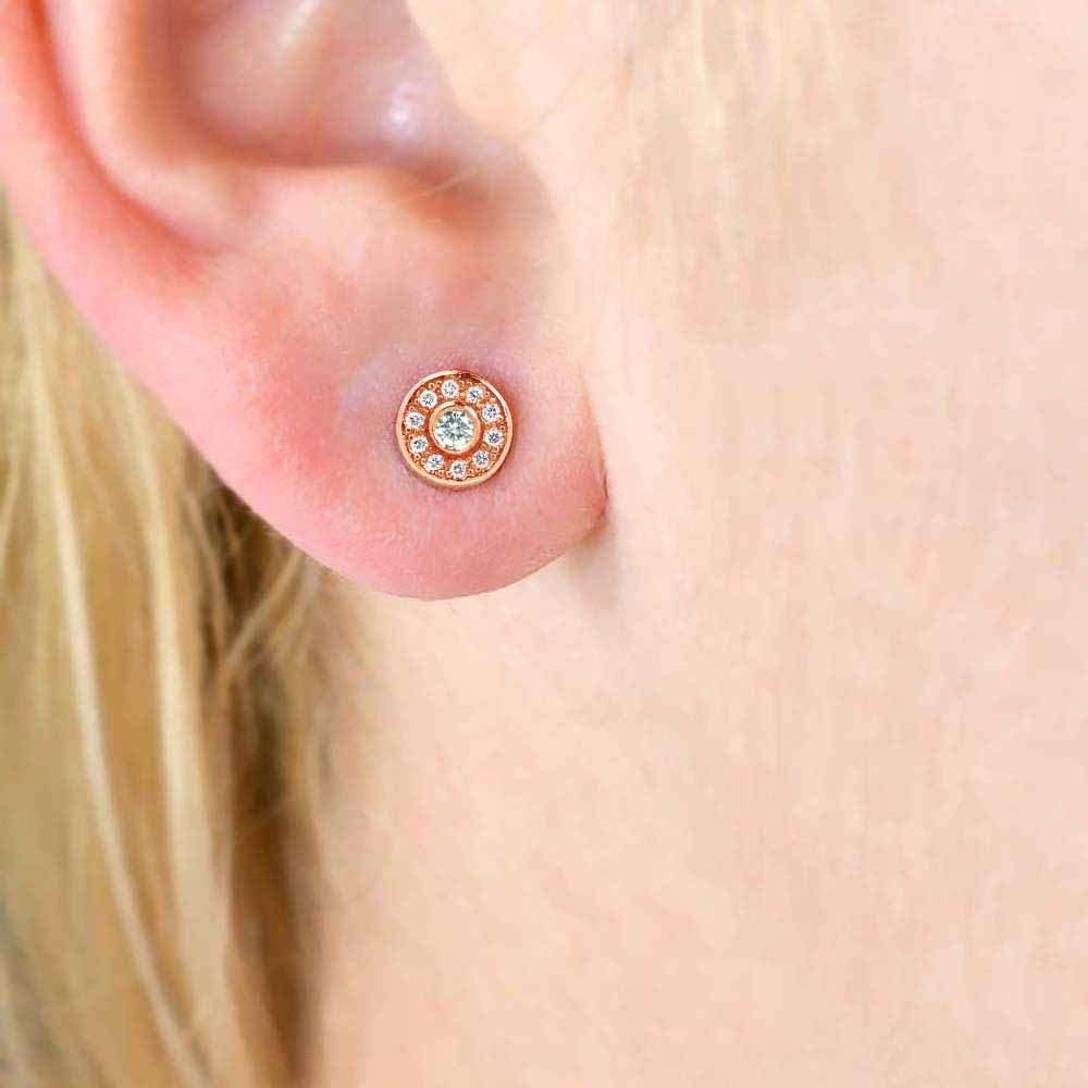 Apró kerek formájú fülbevaló gyémántokkal kirakva, középen egy-egy nagyobb gyémánttal, 14K rose aranyból - 0,15 karát