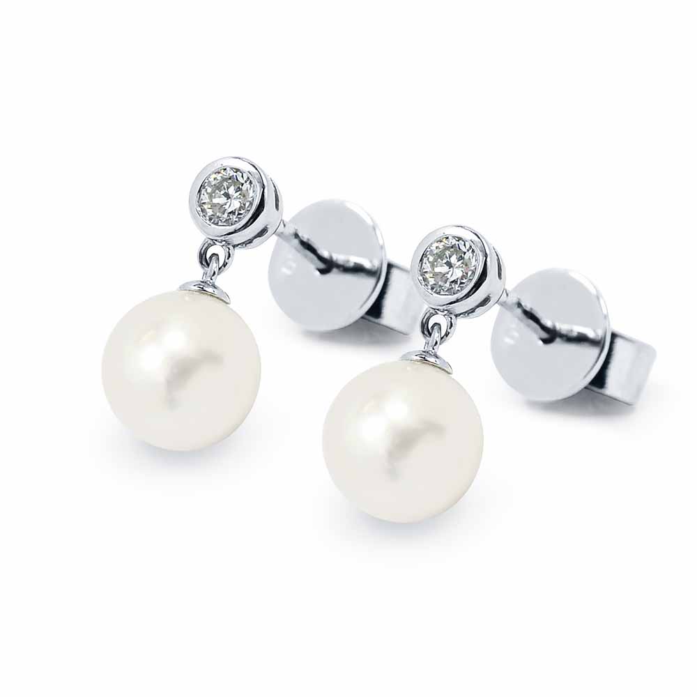 Igazgyöngy fülbevaló 7mm átmérőjű édesvízi gyöngyökkel, melyeket bouton foglalatos gyémánt ékesít - 14K fehérarany