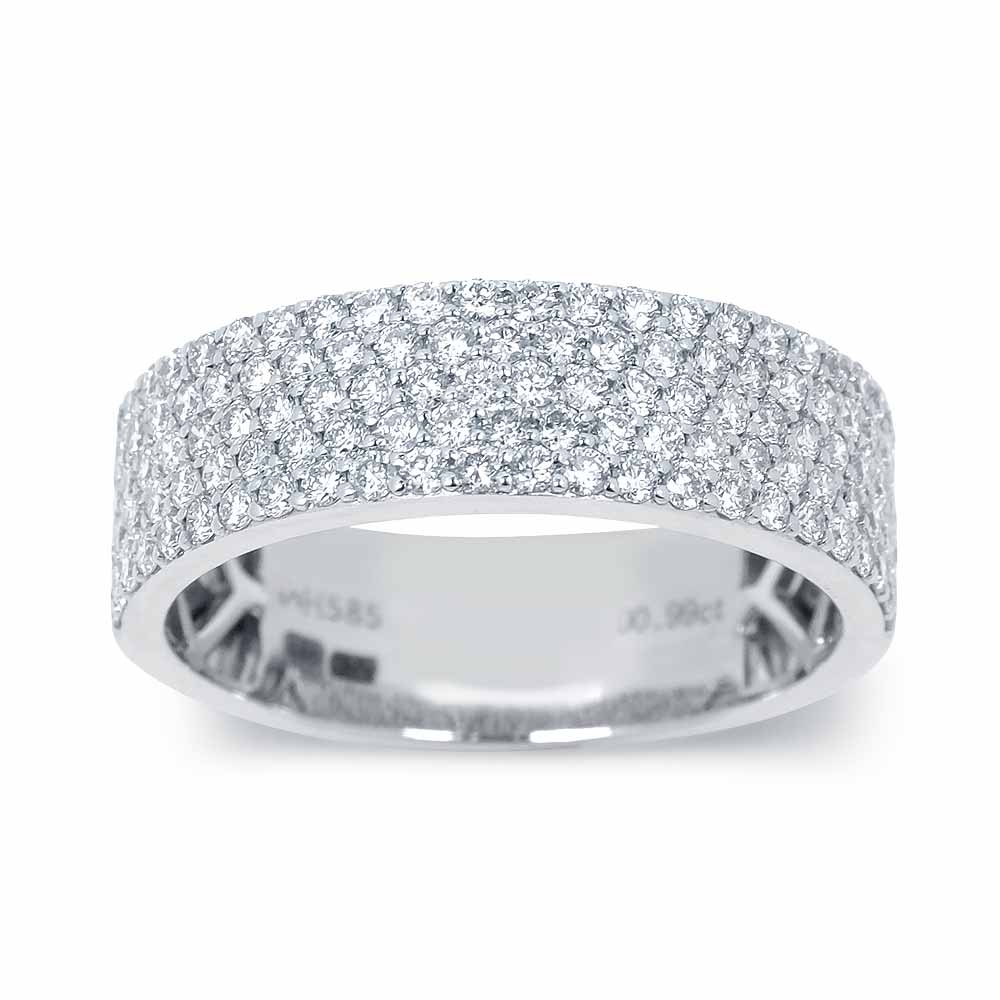 1,2mm-es átmérőjű, briliáns csiszolású gyémántokkal öt sorban foglalt eternity gyémánt gyűrű fehéraranyból készítve. A gyűrű felületének felét 118 darab briliáns csiszolású gyémánt díszíti, melyek összesen közel 1 karátot tesznek ki. A gyűrű félig van körbe foglalva micro-pavé foglalással, a kis gyémántok szorosan egy más mellé helyezve képeznek különleges csillogó felületet. A gyémánt gyűrű teljes súlya 4,1 gramm. Kérésre a gyűrű méretén díjmentesen állítunk, maximum 1-2 számot. Készletről megvásárolható.