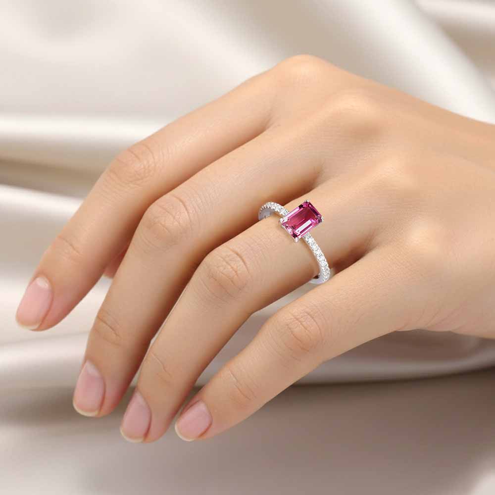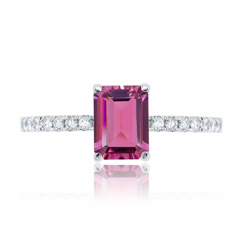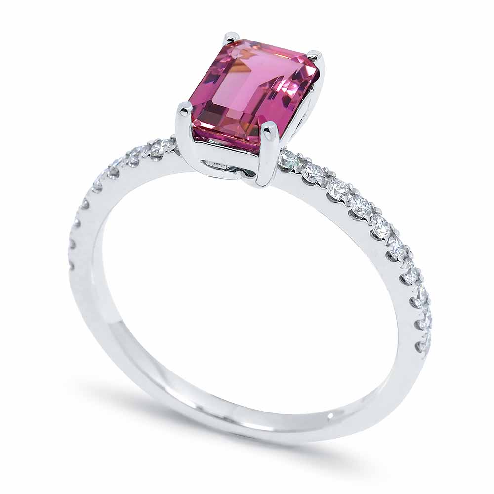 Téglalap alakúra csiszolt sötét rózsaszín turmalin drágaköves gyűrű 14K fehéraranyból készítve, oldalt gyémántokkal