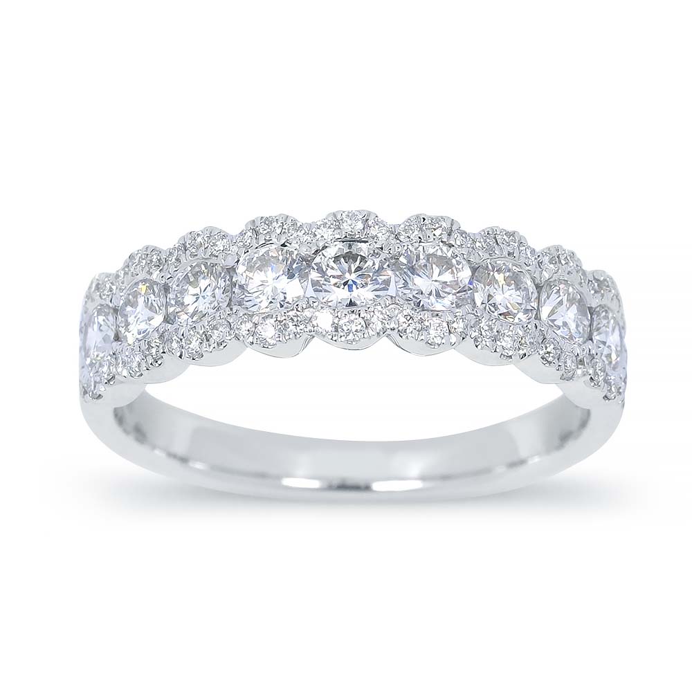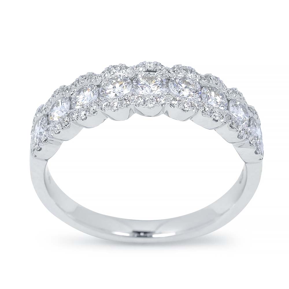Középen nagyobb méretű, briliáns formára megcsiszolt (kerek) gyémánt kövekkel ékesített egyedi gyémánt gyűrű. A gyűrűn egymás mellett sorakoznak a gyémántok, szorosan egymás mellé foglalva, két sín közé beszorítva. A nagyobb gyémántokat tartó íveket végig kisebb méretű gyémánt kövek ékesítik, így a gyűrűbe foglalt gyémántok súlya együttesen 1,3 karát, mindegyik színtelen fehér és magas minőségű (F-G, VS-SI1). A gyémánt ékszer 18 karátos fehéraranyból készült, teljes súlya 3,7 gramm és 69 darab kézzel foglalt brillkő díszíti. Szükség esetén díjmentesen méretre igazítjuk, de maximum 2-3 számot.
