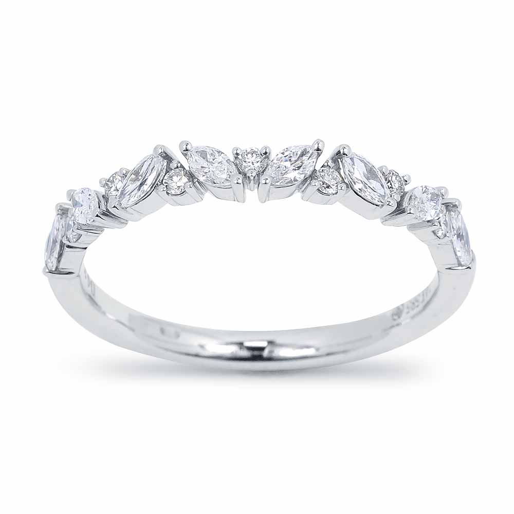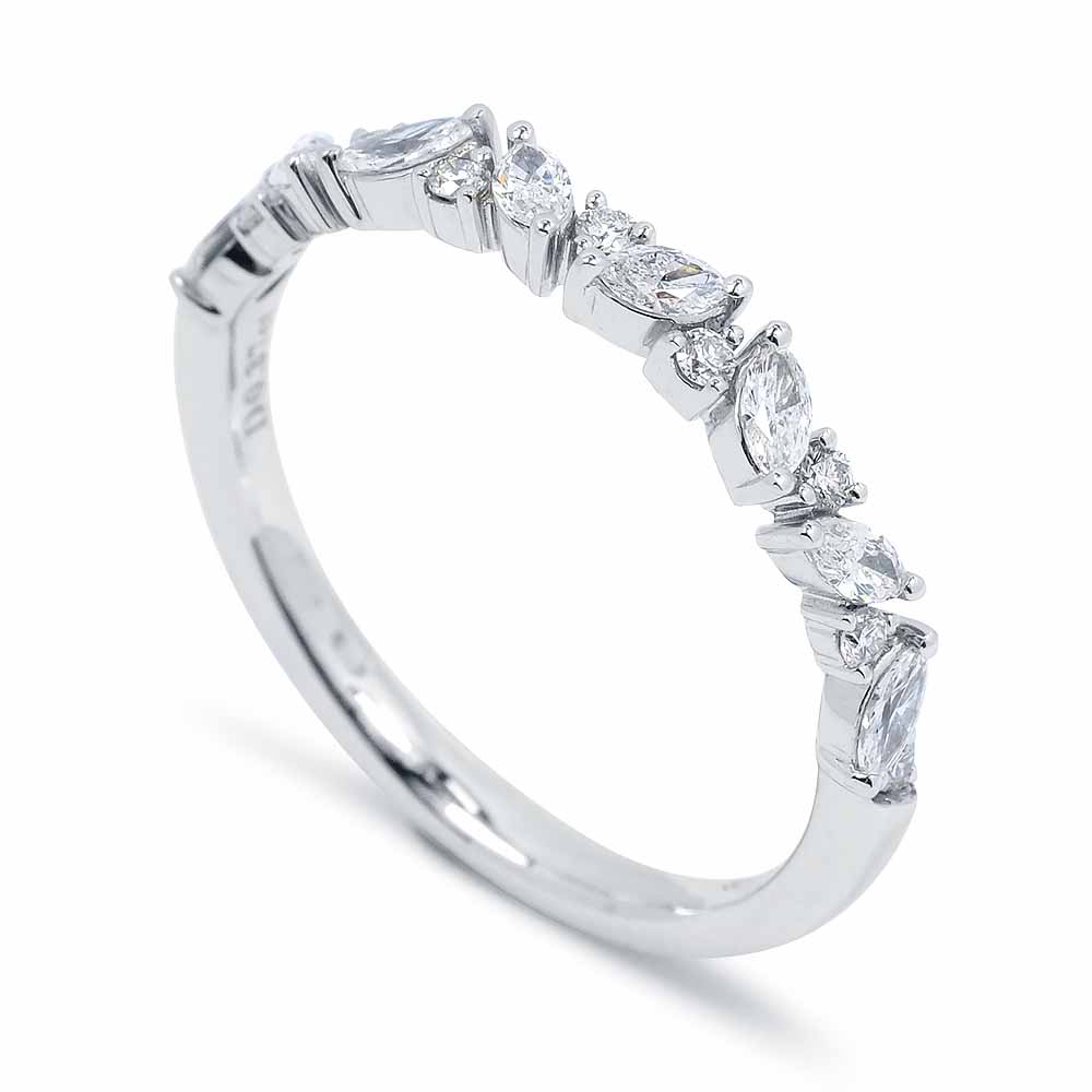 8 Marquise (szilvamag formájú) és 8 briliáns (kerek) csiszolású gyémánt kövekkel felváltva díszített gyémánt gyűrű. Mindegyik drágakő úgy van foglalva, hogy belesimuljon a gyűrű ívébe, így szépséges és kényelmesen hordható mintát alkotnak. A gyémántok összesen 0,37 karát súlyt tesznek ki, mindegyik F színű és VS tisztaság besorolással rendelkezik, a gyűrű felületének közel felét borítják. A gyűrű szélessége mindössze 2,3mm, több gyűrűvel is együtt hordható. A markíz gyémánt gyűrű 14 karátos fehéraranyból készült, súlya 2,1 gramm. 2-3 számot tudunk igazítani a méretén, díjmentesen. Készletről megvásárolható.