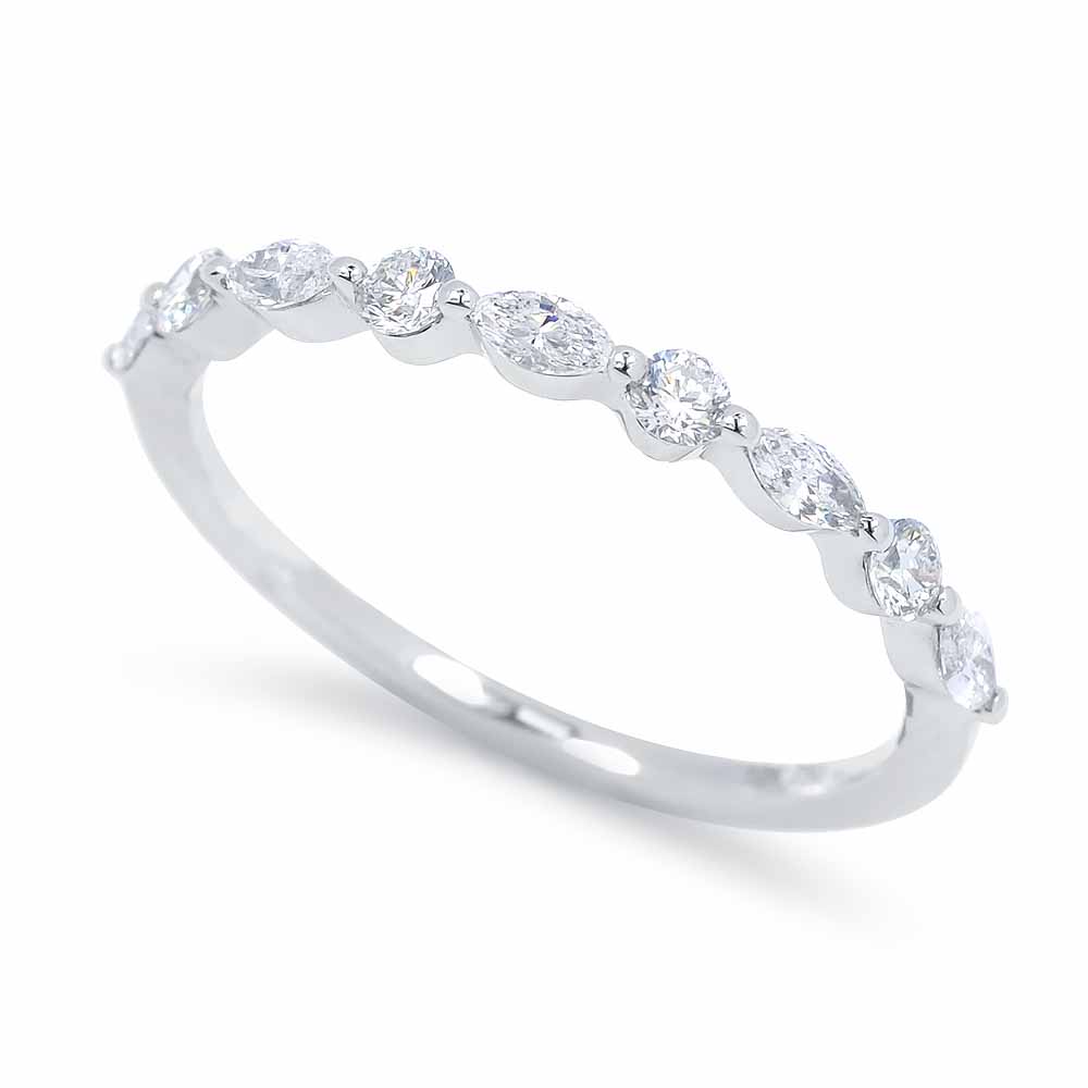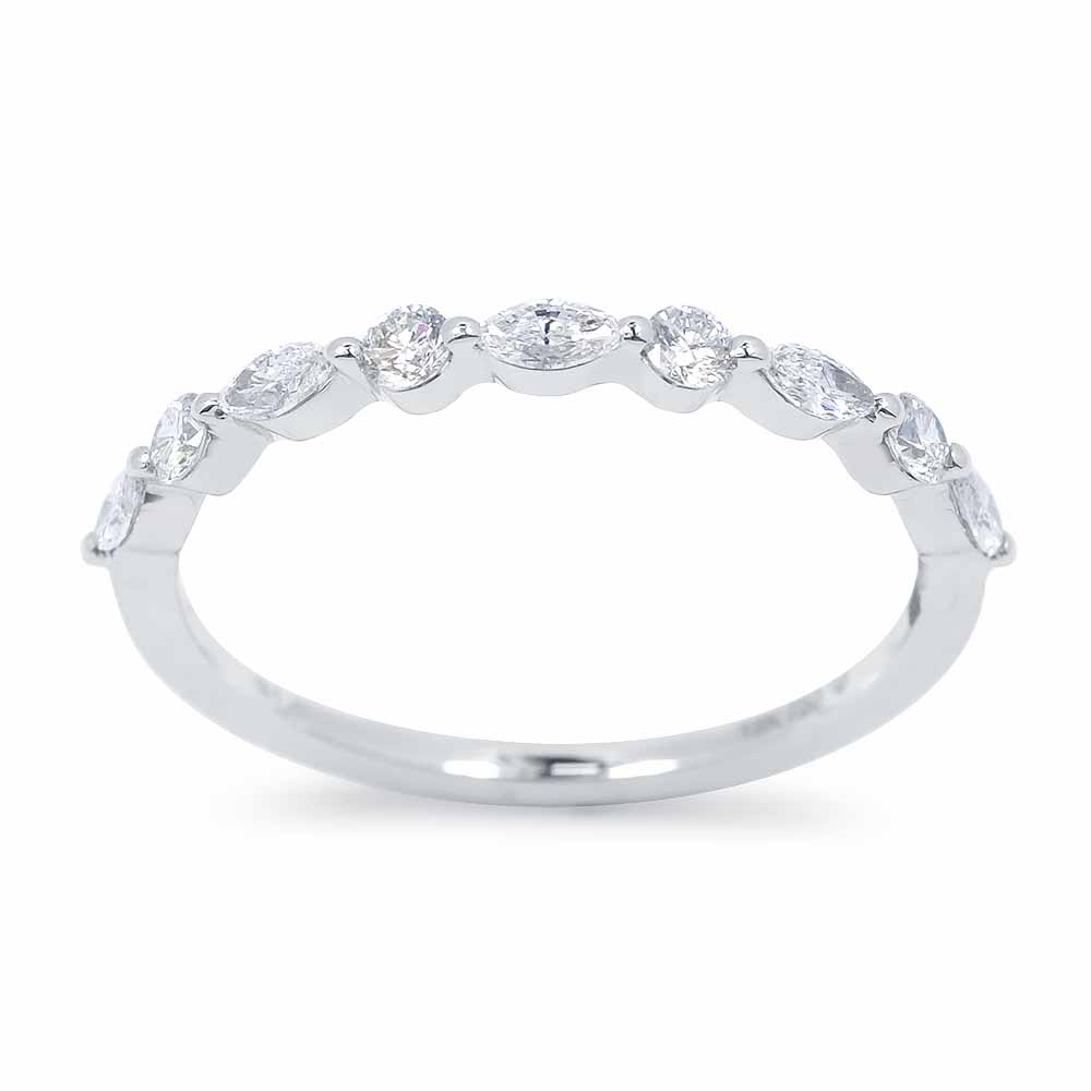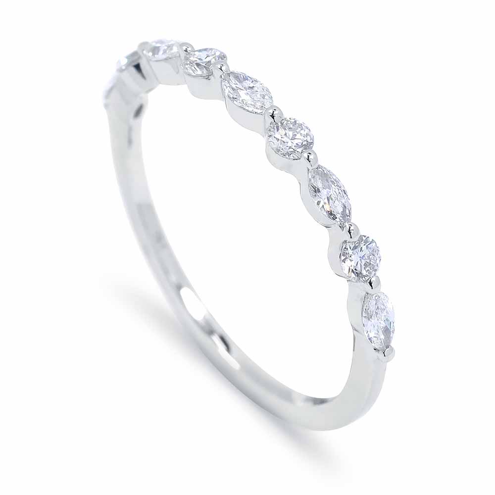 Marquise (hosszúkás) és briliáns (kerek) csiszolású gyémánt kövekkel felváltva díszített gyémánt gyűrű. Mindegyik drágakő úgy van foglalva, hogy belesimuljon a gyűrű ívébe, így szépséges és kényelmesen hordható mintát alkotnak. A gyémántok összesen 0,36 karát súlyt tesznek ki, mindegyik G színű és VS-SI1 tisztaság besorolással rendelkezik, a gyűrű felületének a felét borítják. A gyűrű szélessége mindössze 2,2mm. A markíz gyémánt gyűrű 18 karátos fehéraranyból készült, súlya 1,3 gramm. 2-3 számot tudunk igazítani a méretén, díjmentesen. Keresd a hozzá illő fülbevalót is! Akár karikagyűrűnek is ajánljuk. Készletről megvásárolható.