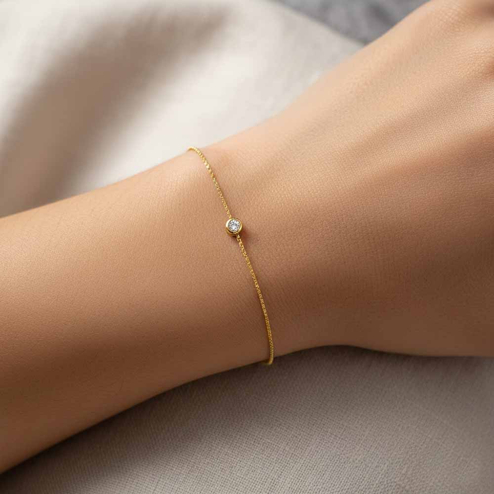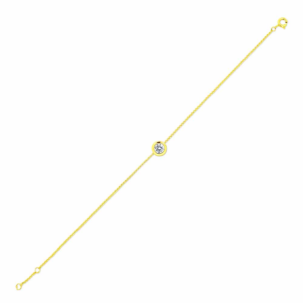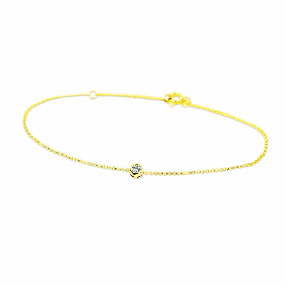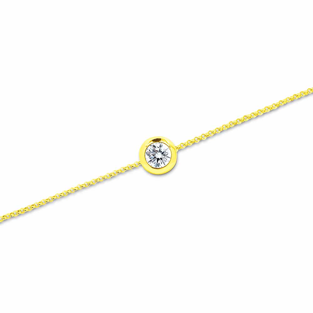 Gyémánttal díszített bouton karlánc 14 karátos sárga aranyból. Az anker típusú láncot középen egy 2,8mm-es valódi gyémánt díszíti gombocska (bouton) foglalatban. A karlánc hossza 18,0cm, de 17,0cm-es hossznál is bekapcsolható. Csillogó F, VS1 minősítésű természetes gyémánt díszíti, melynek súlya 0,085 karát. A gyémánt karlánc 0,9 gramm. Keresd a hozzá illő medált és fülbevalót is! Jelenleg megrendelésre.