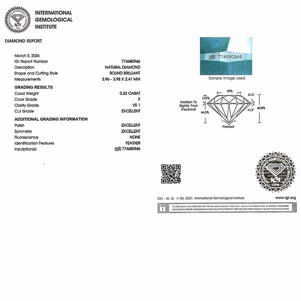 • Egy 4,0mm átmérőjű, briliáns csiszolású, természetes gyémánt (0,23 karát, F szín, VS1 tisztaság, IGI certifikát)
