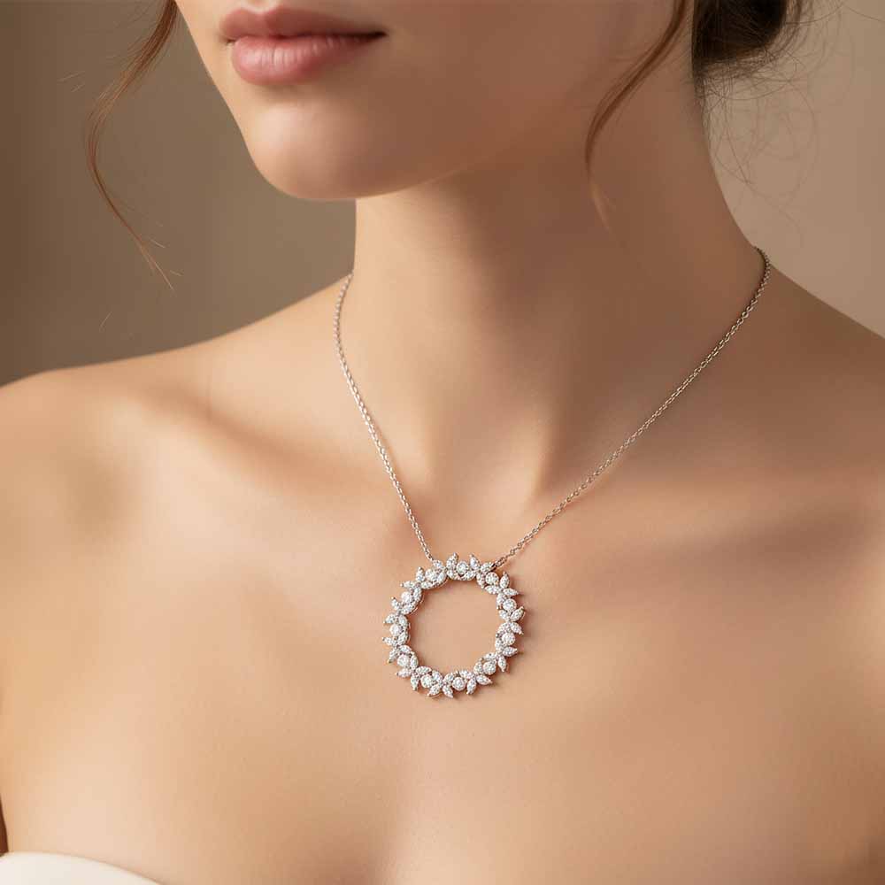 Páratlan, egyedi készítésű gyémánt nyakék, több, mint 2 karátnyi természetes gyémánt kővel készítve. A medált virág formába helyezett, szilvamag (marquise) csiszolású gyémántok és kerek briliánsok váltakozó mintája alkotja. Minden egyes drágakő kiemelkedő minőségű, így gyönyörű fényjátékkal rendelkezik. A kerek medál átmérője közel 3,0cm, és egy erősebb lánchoz van rögzítve, hogy mindenképp viselője biztonságban tudhassa. A nyaklánc hossza 45cm, de 42cm-es hossznál is bekapcsolható. A lánc és a medál súlya együtt 5,2 gramm, 18 karátos fehéraranyból készült. Készletről megvásárolható.
