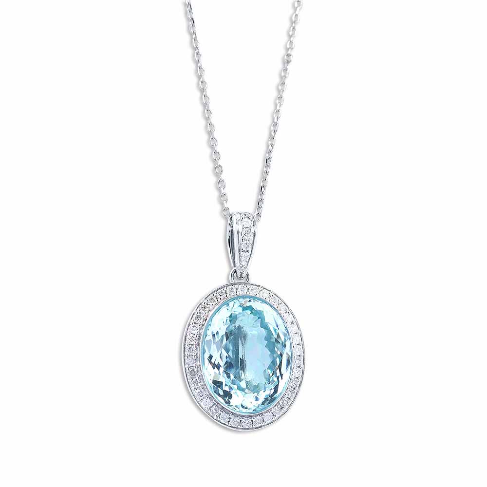 Gyémántokkal körbevett ovális, kék akvamarin drágaköves medál - 18K fehérarany