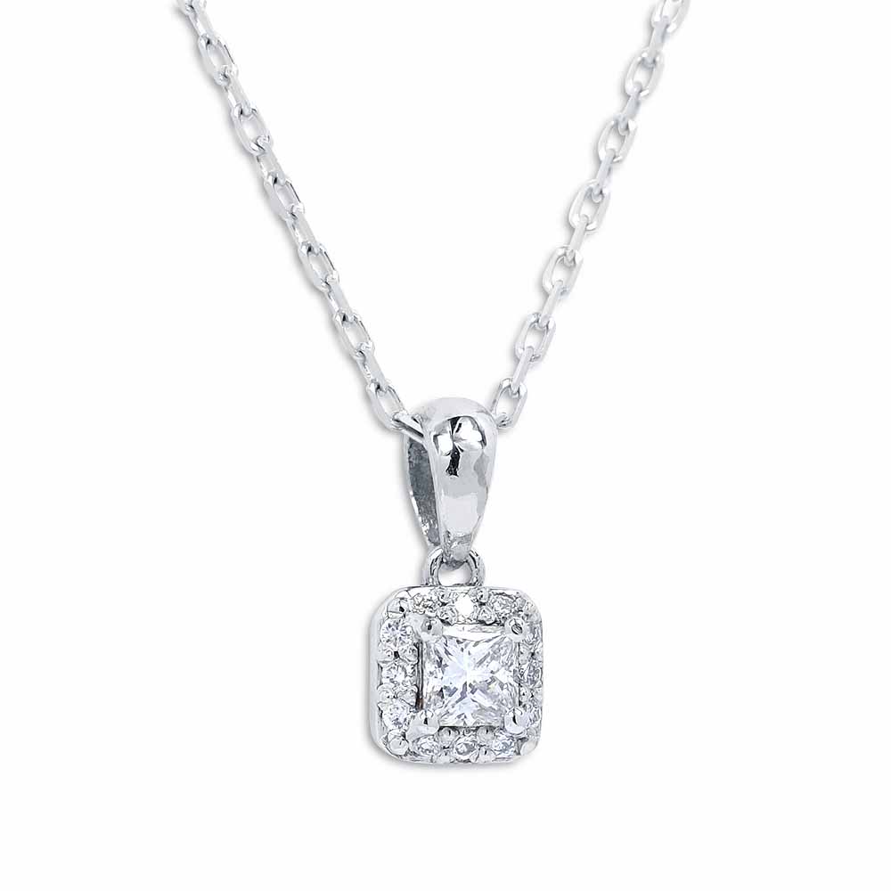 Szögletes formájú medál gyémántokkal kirakva, 14K fehéraranyból, középen princess gyémánttal - 0,34 karát
