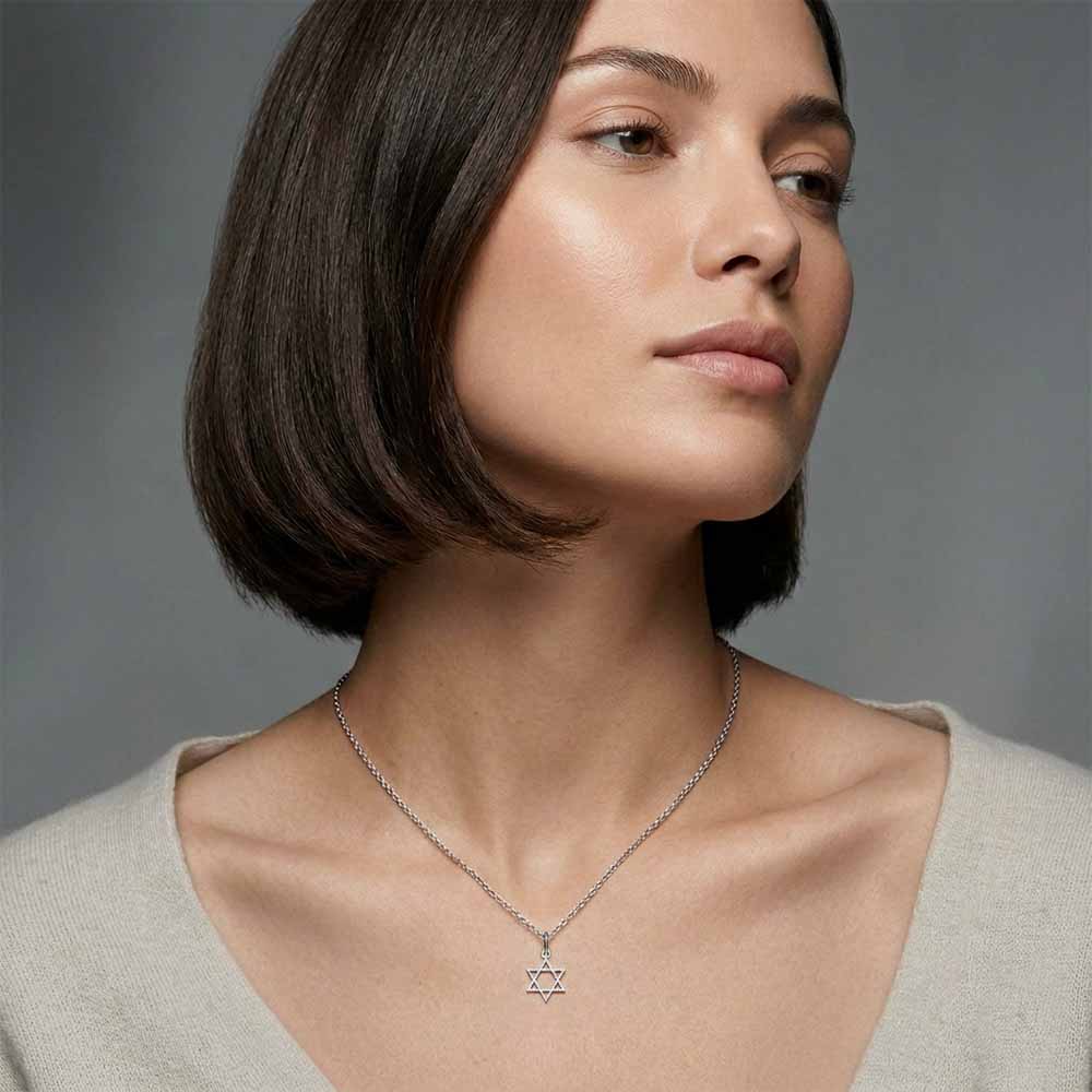 14 karátos fehér aranyból készült Dávid csillag medál gyémántokkal teljes felületén kirakva. A hatágú csillagot 0,085 karátnyi gyémánt díszíti, a medál mérete 1,6x1,0cm. Tetszőleges láncra is felhúzható, a medál súlya 0,4 gramm. Készletről megvásárolható.