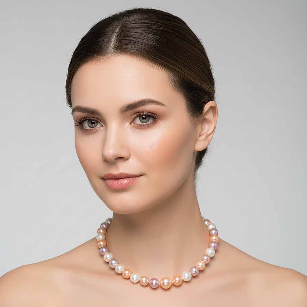 Kimagasló minőségű, szabályos kerek és magas gyöngyházfényű, édesvízi tenyésztett igazgyöngyök nyaklánc. A gyöngyszemek AAA Top (AAAAA) minősítésűek, formájuk és lüsztréjük a sósvízi gyöngyökével vetekszik. A 8-8,5mm-es gyöngyök fehér, barack és világos lila árnyalatokban tündökölnek, egyenként csomózottak és egy gömb zár tartja össze őket, mely ezüstből készült. A multicolor gyöngysor 46,0cm hosszú, súlya 40,3 gramm. Készletről megvásárolható.