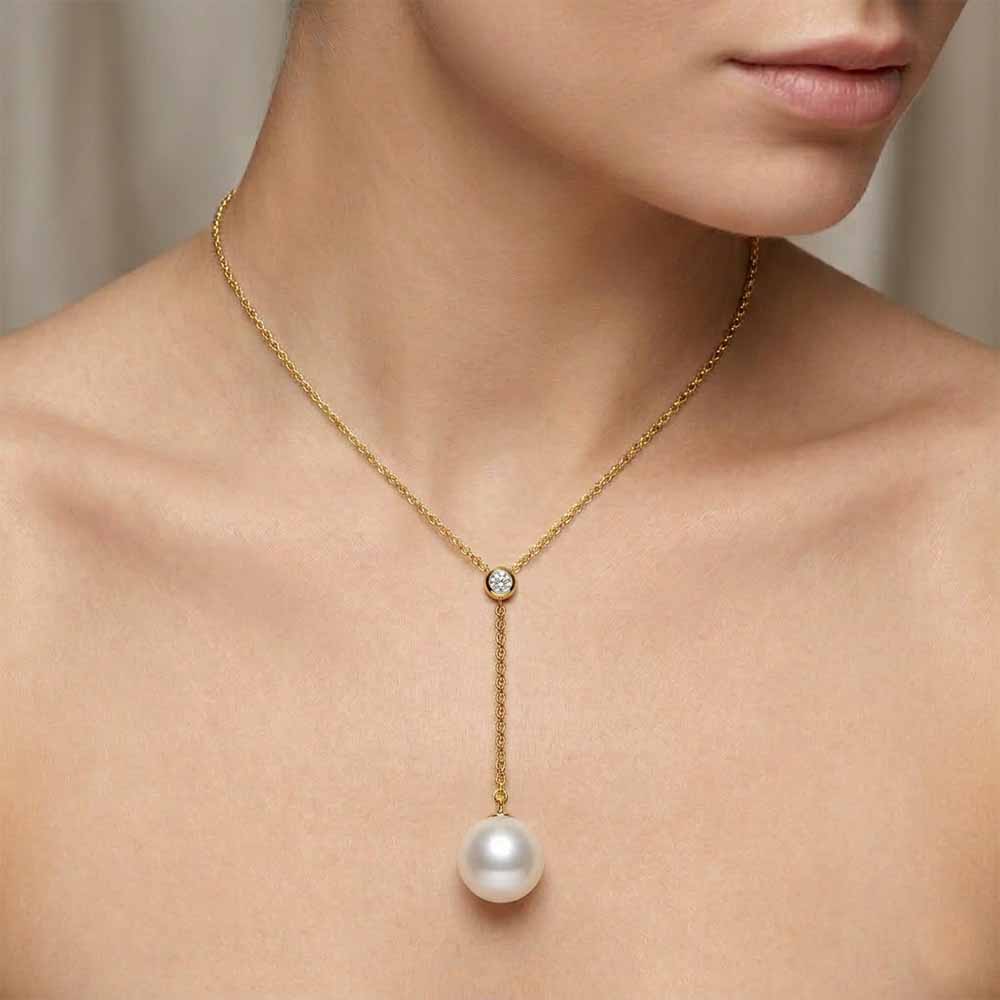 Sósvízi akoya igazgyönggyel díszített lógós nyakék aranyból - buton gyémánttal
