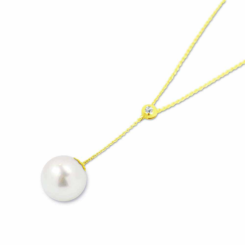 Magas gyöngyházfényű, sósvízi tenyésztett igazgyönggyel díszített nyakék 14 karátos aranyból készítve. A 42cm hosszú nyaklánc közepén egy gyémánt helyezkedik el zárt, buton foglalatban. A gyémánt alatt egy láncra függesztett gyöngyszem csüng. A gyémánt és a gyöngy között 3,0cm-es a távolság. A nyakéket díszítő japán akoya gyöngy minősítése AA+, szabályos kerek és szép gyöngyházfénnyel rendelkezik. A gyémánt kő súlya 0,084 karát, minősítése F VS1. A teljes nyaklánc súlya 2,5 gramm és hozzá illő fülbevaló is kapható! Jelenleg megrendelésre.