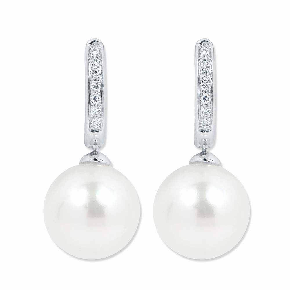 Gyémántokkal kirakott fülbevaló 10,0mm átmérőjű édesvízi tenyésztett igazgyöngyökkel, fehéraranyból
