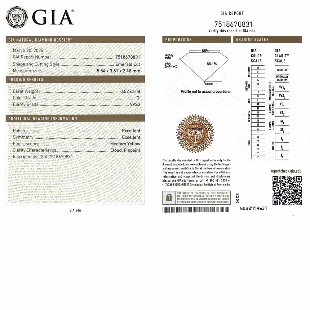 - Egy 5,5x3,8mm-es, smaragd csiszolású, természetes gyémánt (0,5 karát, D szín, VVS2 tisztaság, GIA certifikát, Excellent csiszolás)