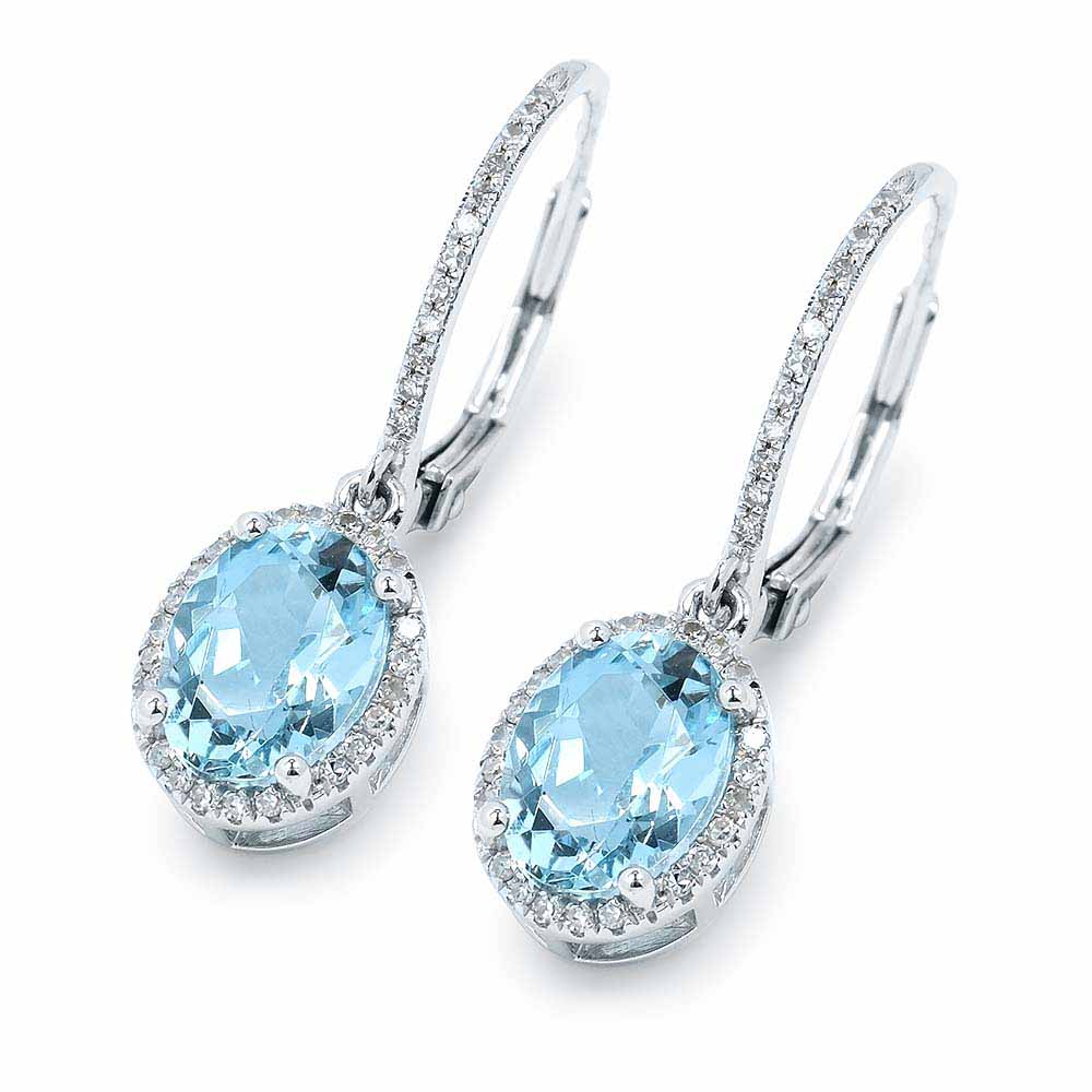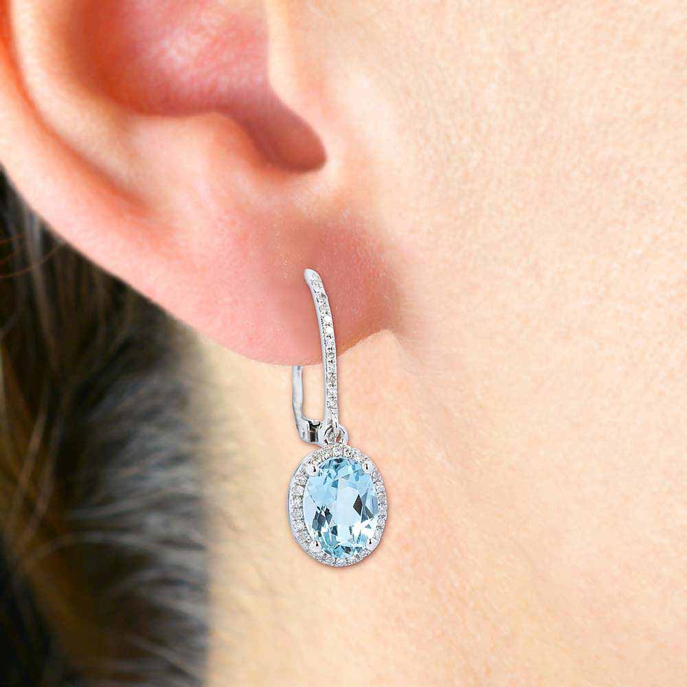 Élénk, világos kék akvamarin drágakővel készült klasszikus, elegáns fülbevaló. A fülbevalót díszítő két ovális drágakő, több mint két karát együtt. Az akvamarin köveket apró gyémántok veszik körül. A fülbevaló felső szárát is végig pici gyémántok ékesítik. A fülbevaló, hasonlóan valamennyi ékszerünkhöz, kézzel készült, mindegyik drágakő is kézzel került befoglalásra. Az akvamarin és gyémánt köves fülbevaló pár súlya összesen 3,3 gramm, így nem húzza a fülcimpákat, kapcsos zárral rögzül.