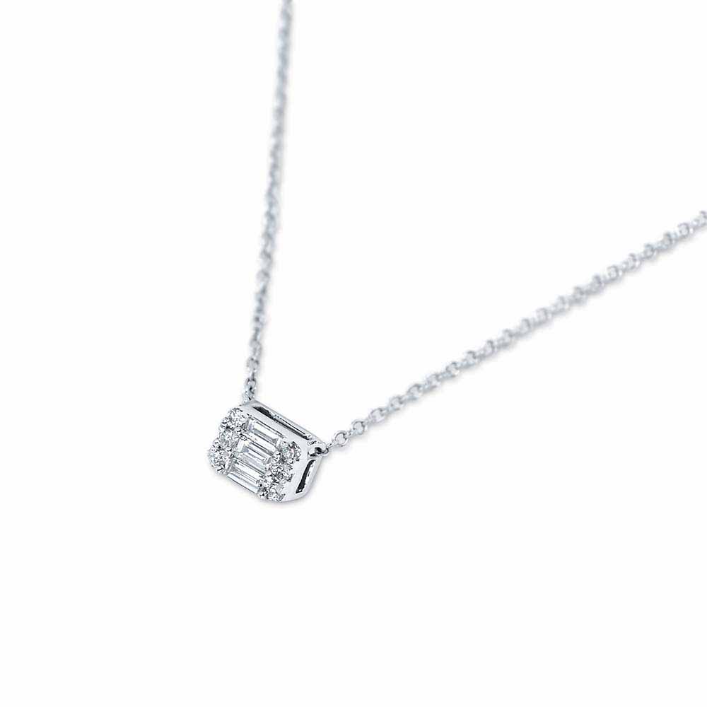 Szögletes formájú medál középen baguette gyémánttal, 14K fehéraranyból, láncon