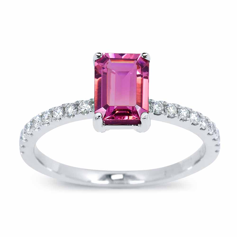 Téglalap alakúra csiszolt sötét rózsaszín turmalin drágaköves gyűrű 14K fehéraranyból készítve, oldalt gyémántokkal