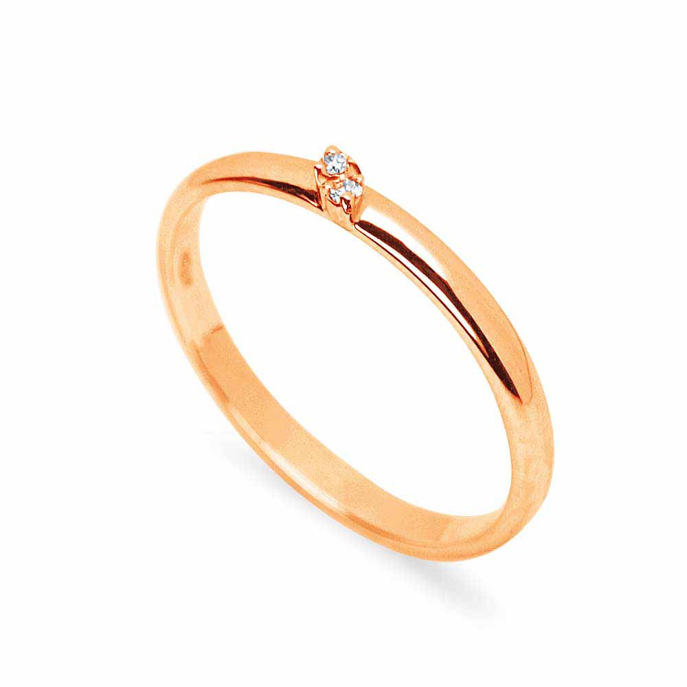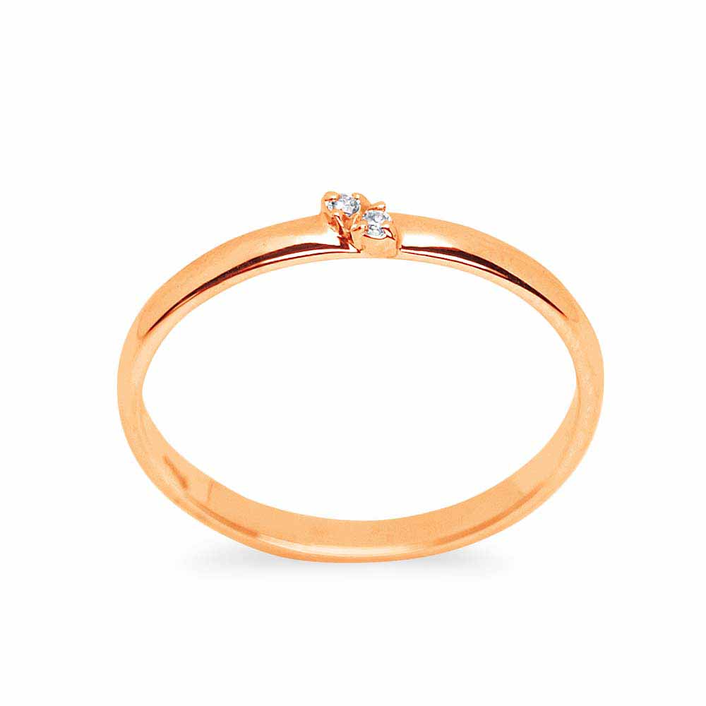 Két apró valódi gyémánt kővel díszített rosegold gyűrű, akár eljegyzési gyűrűnek is! A két 1,2mm átmérőjű drágakő szorosan egymáshoz simul a lapított profilú kecses gyűrűn, súlyuk összesen 0,014 karát. 14 karátos rose aranyból, kézzel készítve. Kérésre díjmentesen a megfelelő ujjméretre igazítjuk, akár utólag. Készletről megvásárolható.