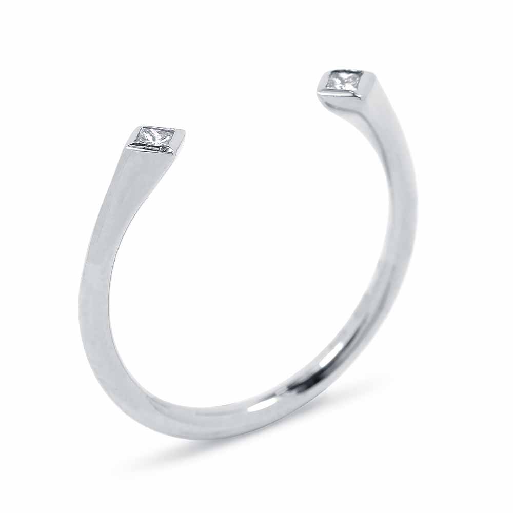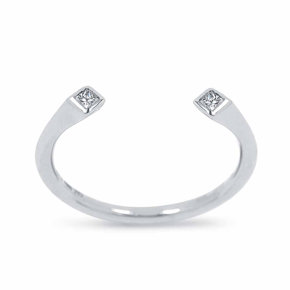 Két apró princess (négyszögletes) gyémánt kővel díszített fehérarany gyűrű, egyedi, nyitott stílusban. A két princess gyémánt a gyűrű két szárának végén díszeleg, zárt foglalat öleli körbe. A princess gyémánt gyűrű súlya 1,5 gramm, 14 karátos fehéraranyból készült. A két gyémánt kő összesen 0,07 karát. Hordjál akár többet együtt! Kérésre a gyűrű méretén díjmentesen igazítunk. Készletről megvásárolható.
