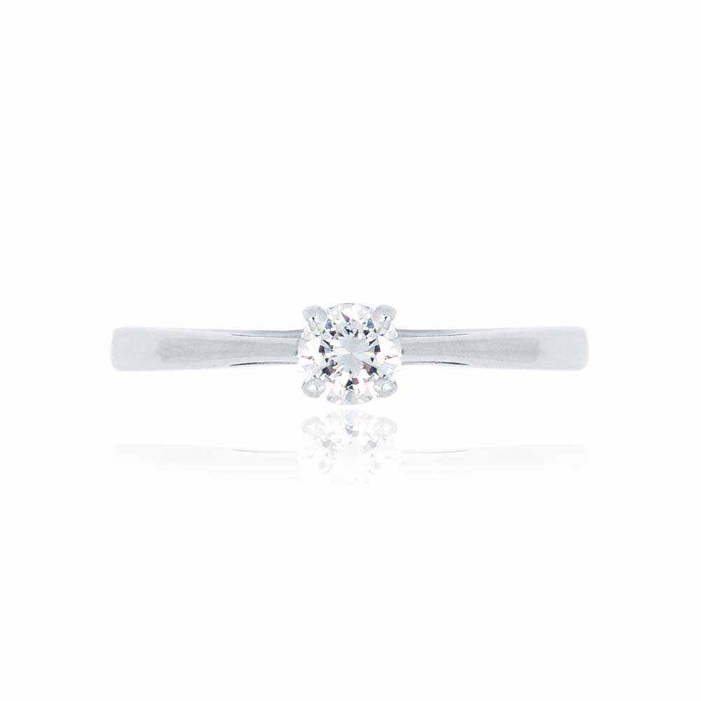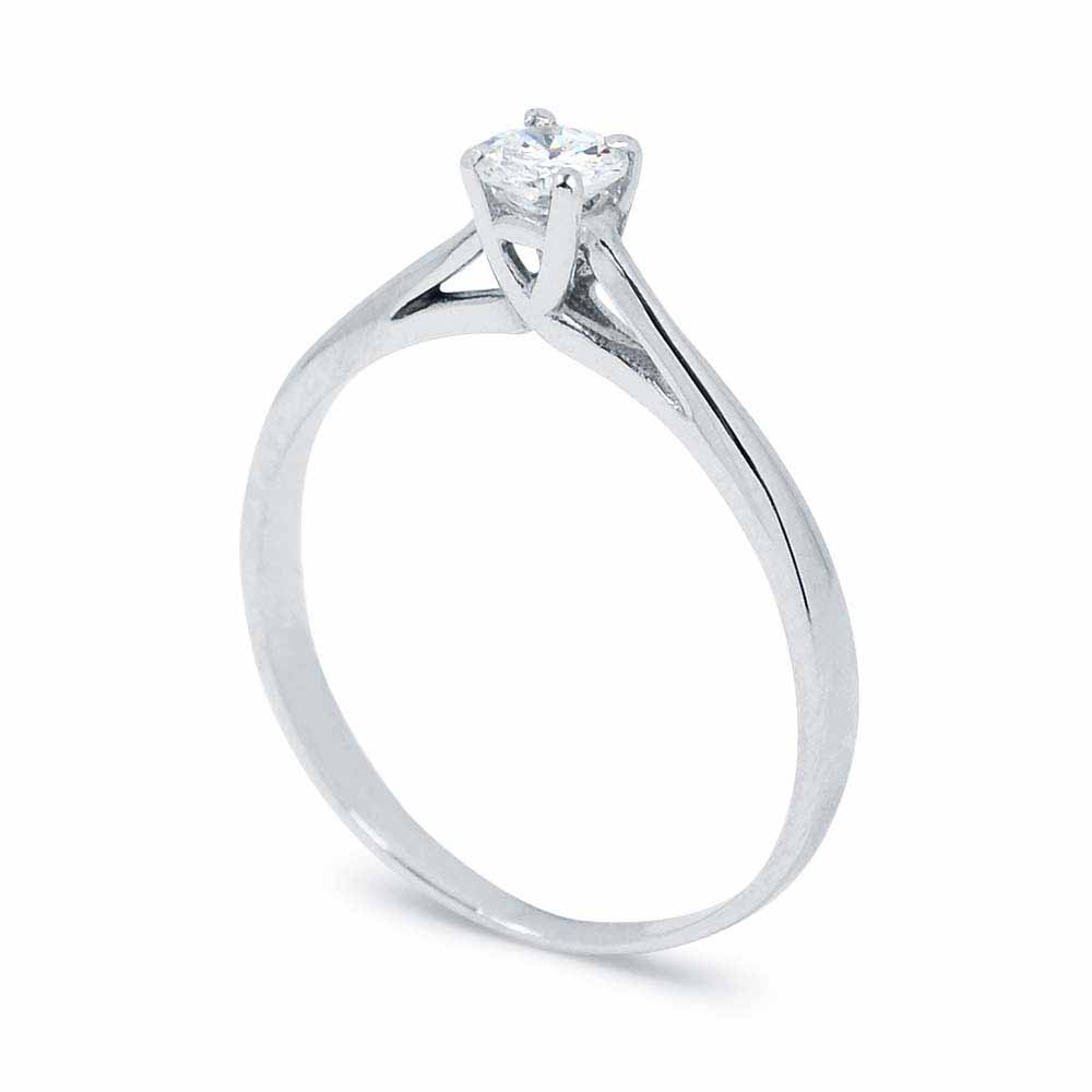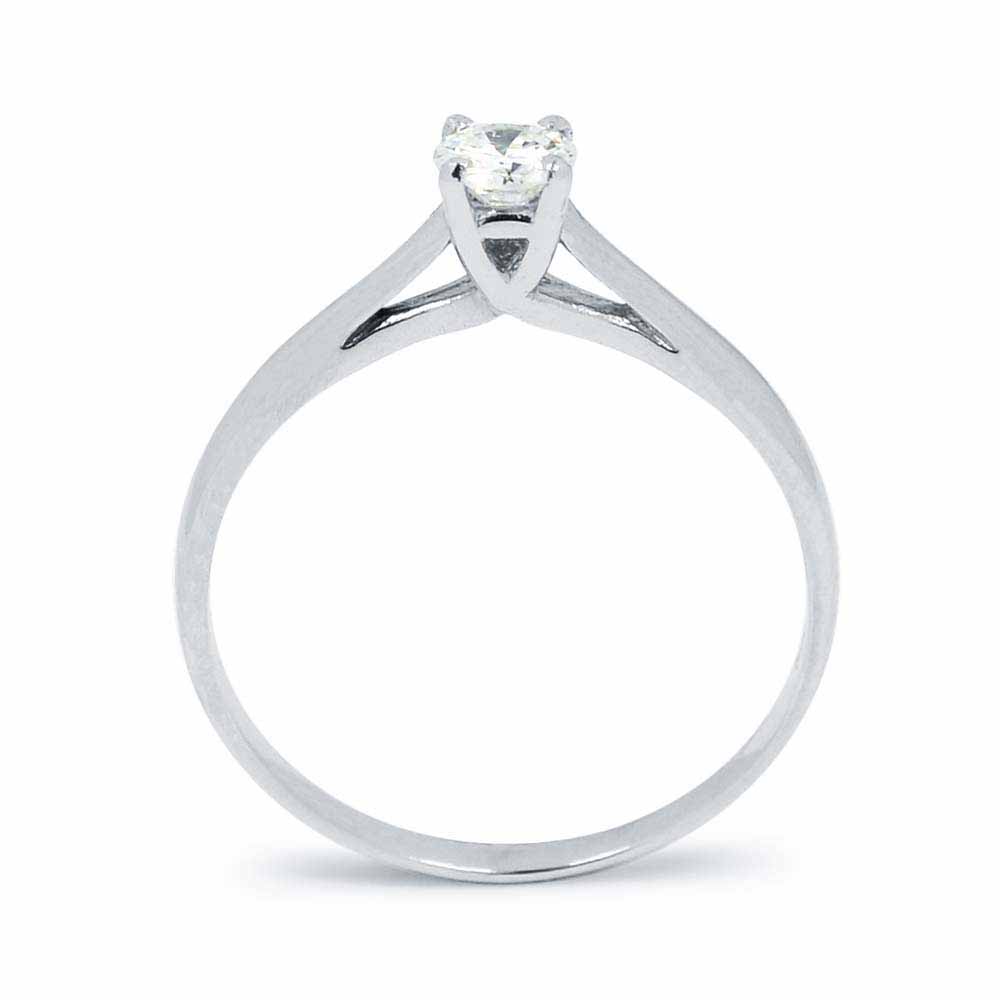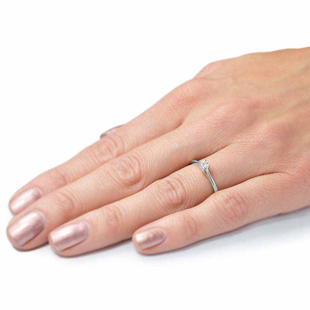 Gyémánt eljegyzési gyűrű 14 karátos fehér aranyból készítve. A gyűrűt egy 3,7mm átmérőjű, 0,18 karátos briliáns csiszolású gyémánt díszíti, melyet kecses, ívelt foglalat tart biztonságban. A briliáns alatt a gyűrű szárai keresztezik egymást, finom mintát alkotva. A gyűrűben lévő gyémánt 'G' szín és 'VS1' tisztaság besorolással rendelkezik. A gyémánt eljegyzési gyűrű összesen 1,3 gramm. Szükség esetén díjmentesen méretre igazítjuk. Készletről megvásárolható.