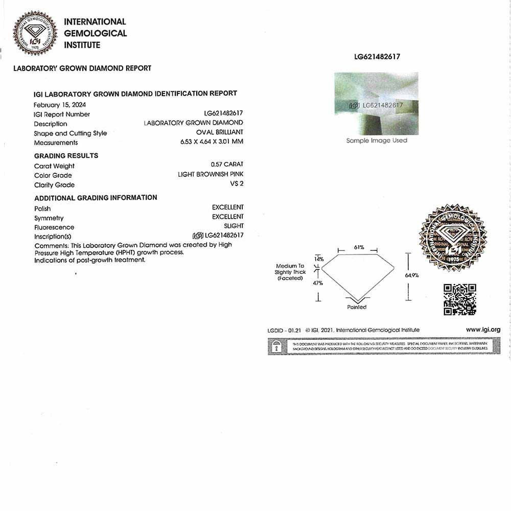 • Egy darab 6,5x4,5mm átmérőjű ovál csiszolású, mesterséges gyémánt (0,57 karát, l. brownish pink szín, VS2 tisztaság, Excellent, IGI cert)